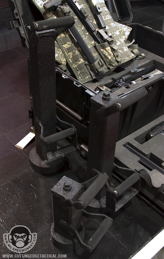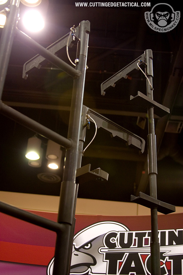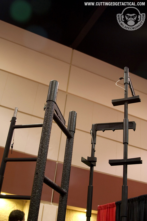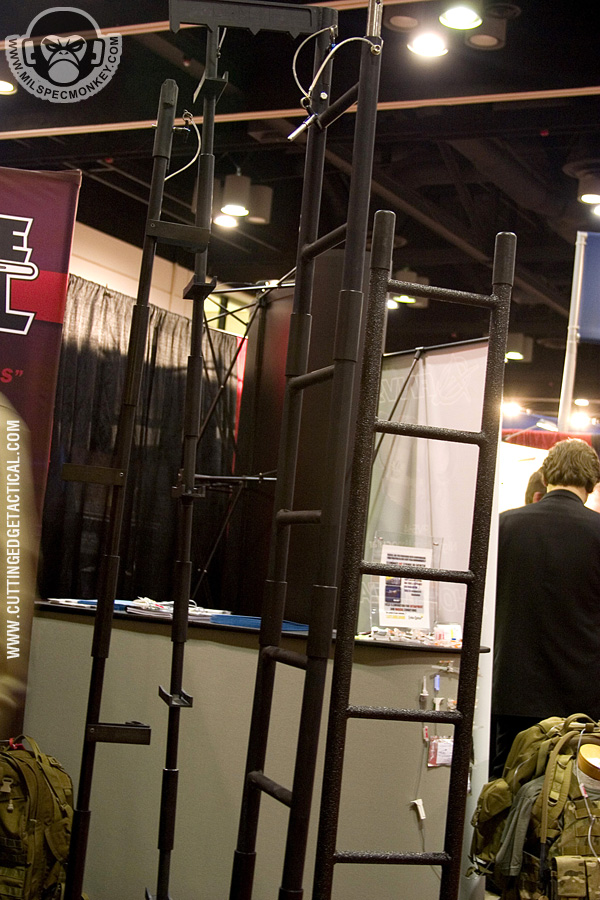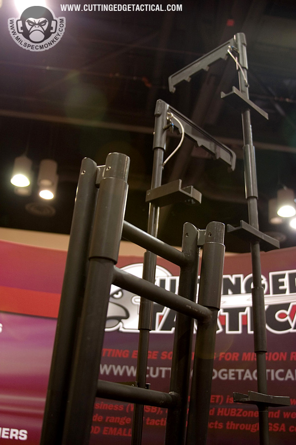 CET specializes in heavy duty gear for the more "rough" tasks of tactical operations. Starting off with the door rams, they look simple offhand, but work great with rollers on the handles. This allows for the classic door busting movements to be performed as easy as possible. 3 sizes are available and it appeared all could have extra weight added through a bolt hole. Most of the ladder systems consist of a simple, but effective joint cover system and range from double pole to single with steps. Not shown was an awesome hook and pole ladder that broke out into a cargo style ladder. I hope to have a video demo later. Also available were almost all the classic manual breaching tools in collapsible form. Using a heavy duty spring lever, the tools can be deployed from compact 17" to 28" extended with gravity. Tolerances are loose to keep smooth operations in harsh environments. I'm keeping things a little vague here since I have 2 great video demos available: