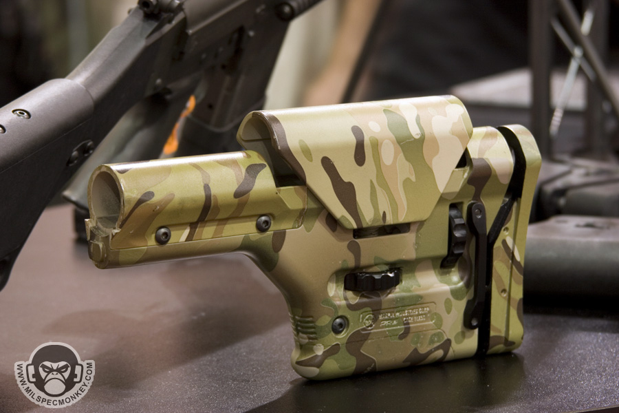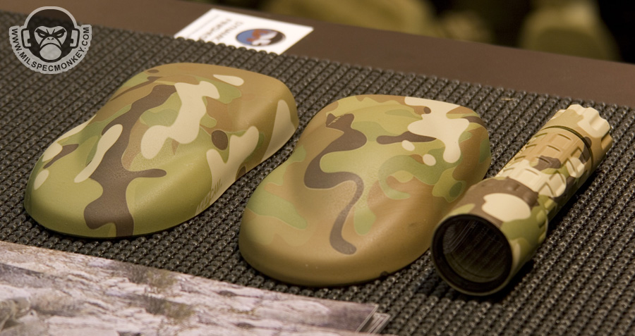 Crye had some interesting updates to their already innovative products. The new combat pants and shirt have been slimmed down for weight, but kept their main features such as integrated pads. The pants had some interesting stretch panels I had not seen before and shirt will now be made with Drifire for the main torso area which is great wicking / anti-flame material. I couldn't take pictures, but the revised Crye plate carrier was on display. They toned down all the hardware, so it looks more like a current plate carrier, however is still has most of the previous features. The stock locks are gone, and the plates are inserted by more traditional means. Also shown were a couple of items for examples of Multicam water transfer printing. Enough of my blabbn' check out the video demo: