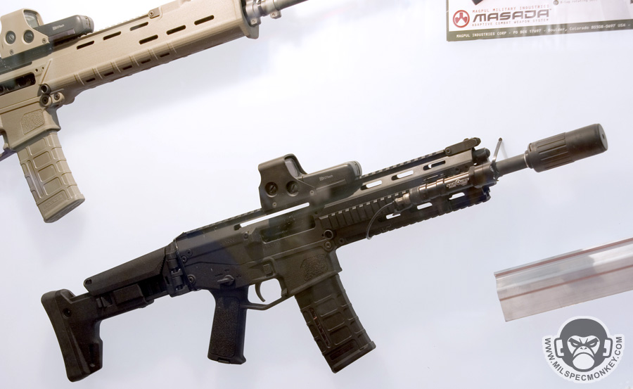 Although Magpul is known for many great rifle accessories, they really made a rukus this year at shotshow revealing their full rifle project, Masada. A bit like the combination of a G36 and a SCAR, the Masada looks like a well thought out piece. Ambi everything possible except ejection port, slide release near trigger, quick change capable barrel, adjustable and foldable stock, and much more. Be sure and check out the video demo on this one: