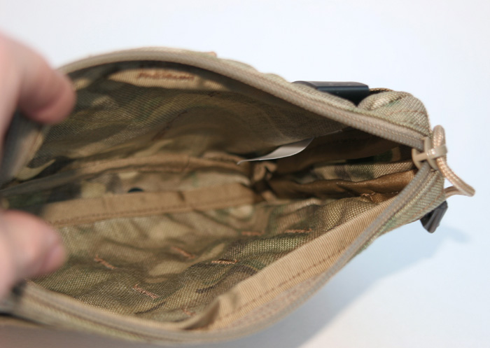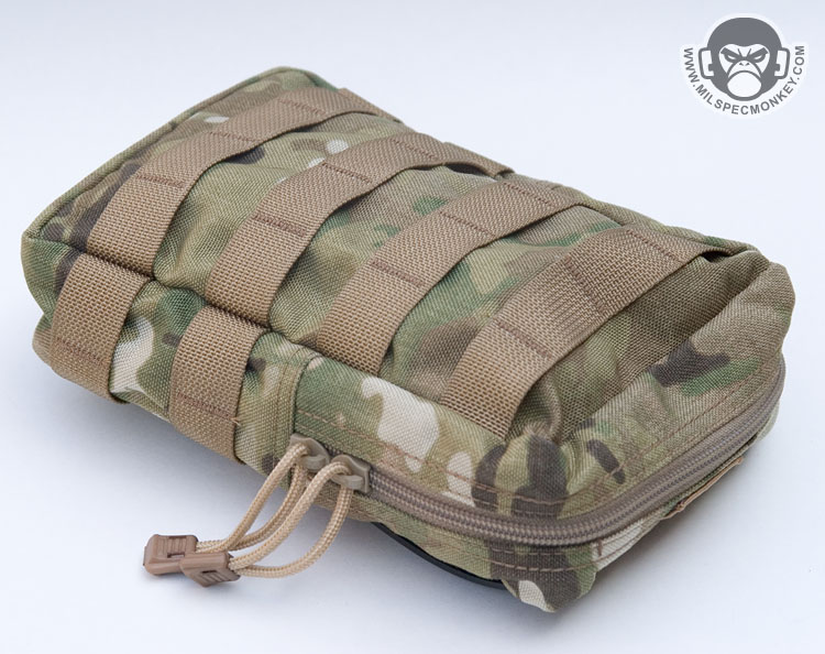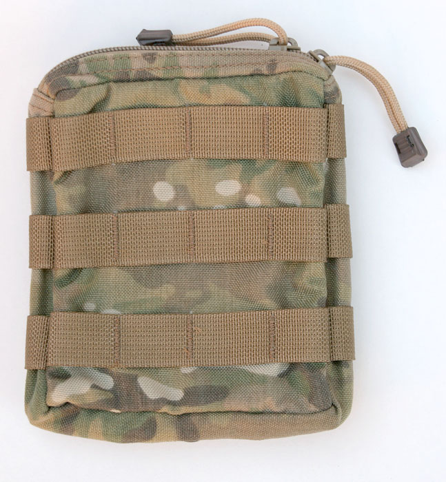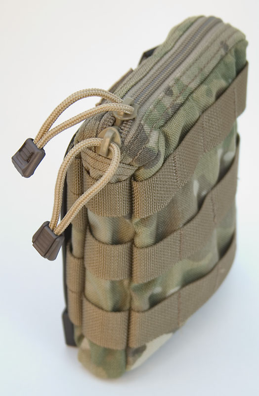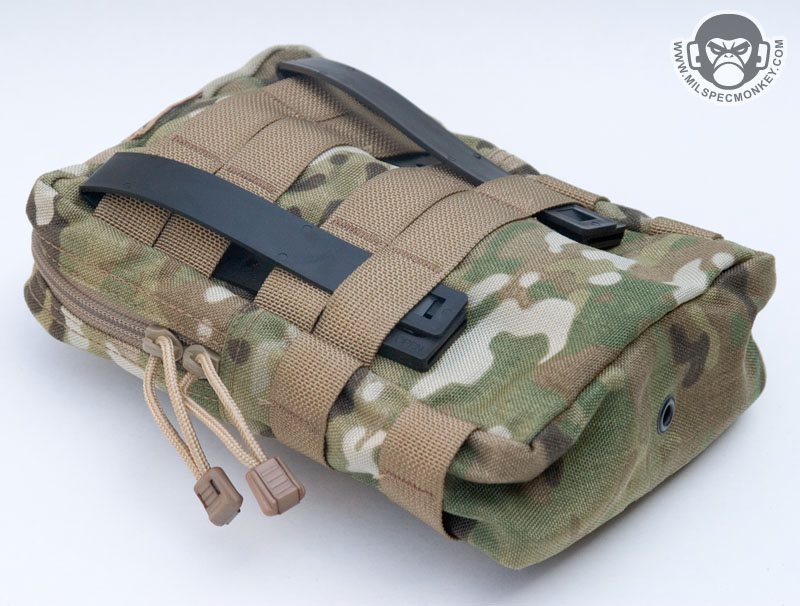 Originally intended for medical supplies, but can also work well as a general purpose pouch with built in elastic and pockets. The pouch can be zippered down for a full 180 degree opening, but a 550 cord and cordlock system is standard to adjust and limit the opening. Has bonus PALS and loop velcro on the front, a very full featured pouch especially for the price, $32.95. Comes with long Malice Clips.