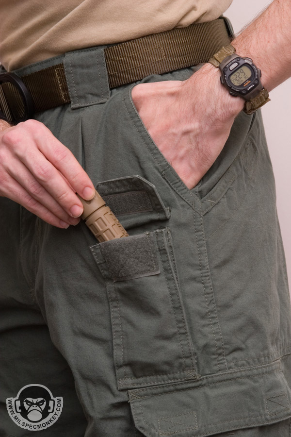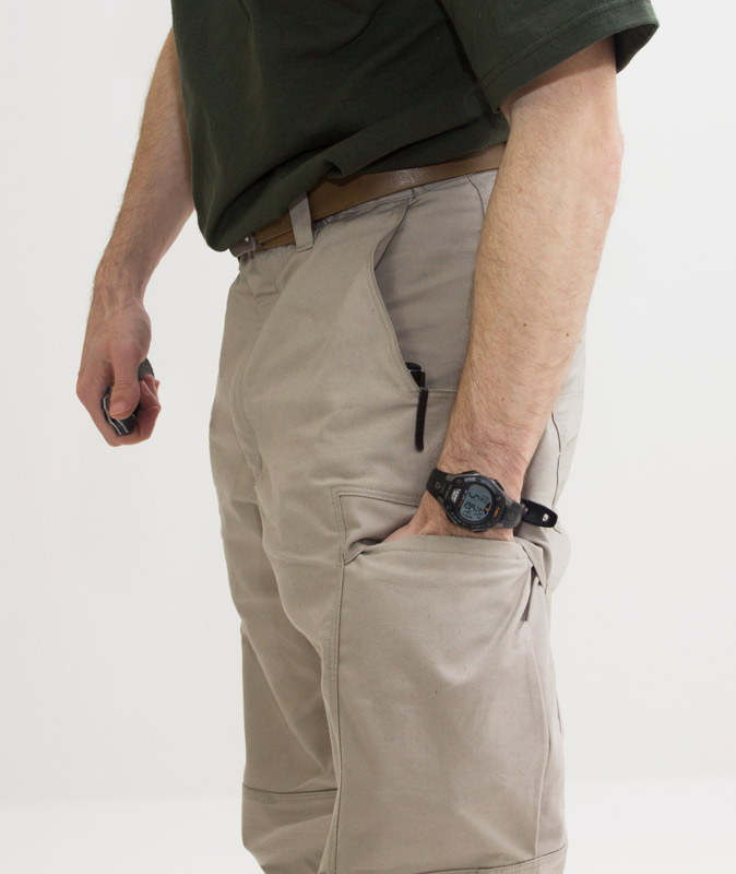 Need an affordable tactical pant? Look no further, these 24/7 pants are a great bang for the buck. The main design is based on a classic cargo pant, but includes many modern features. Starting off with the core material, it is heavier than rip-stop consisting of 8.5oz 100% cotton canvas that is pre-washed to reduce shrinking and fading. The belt loops are thick for durability and the main top closure uses a basic metal snap. The fly uses a durable YKK metal zipper and a backup button is available if for some reason you worry about your fly zipping down on its own.