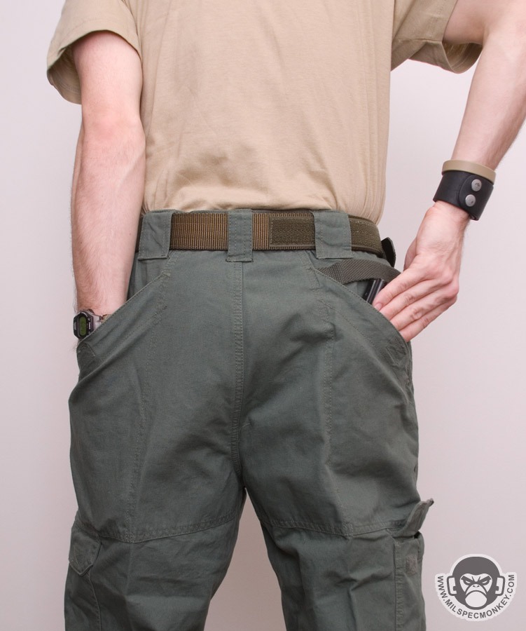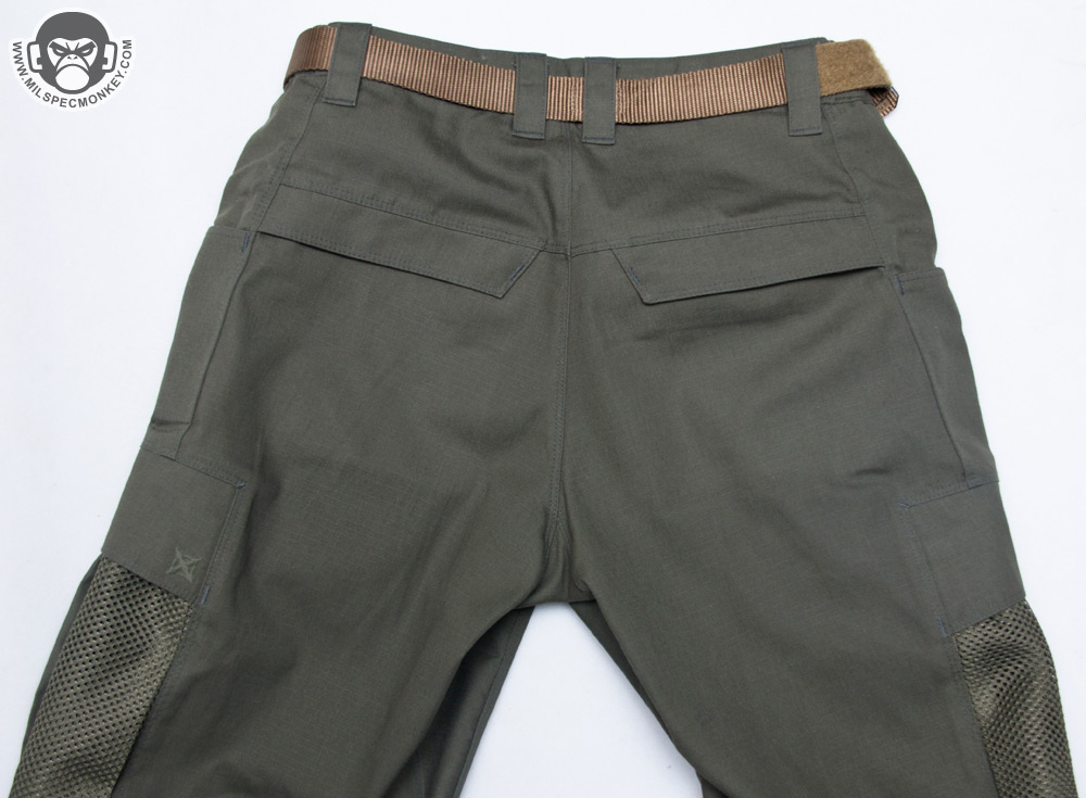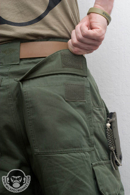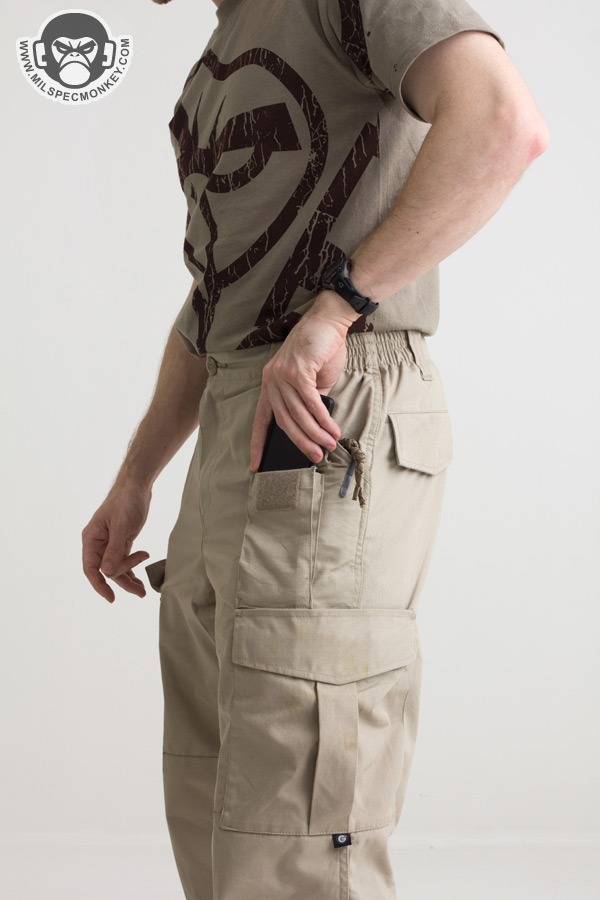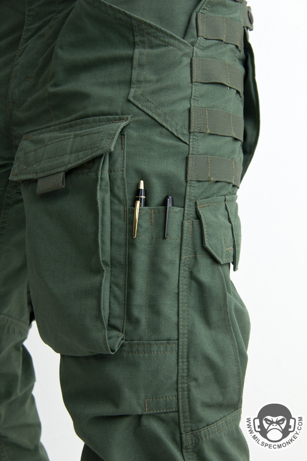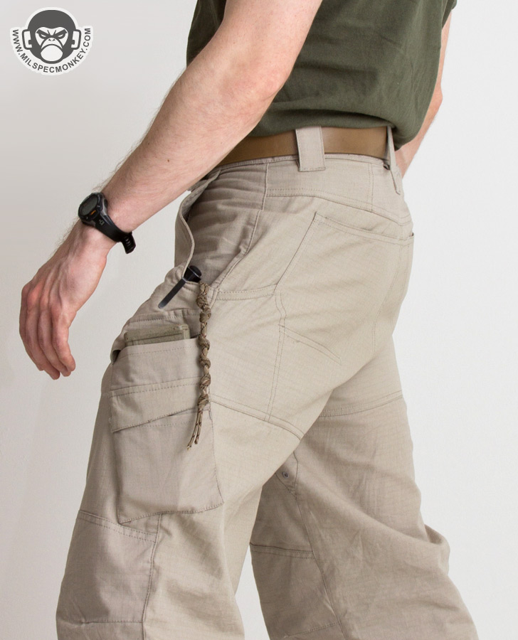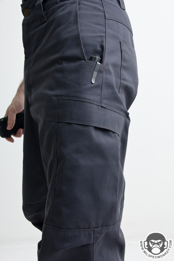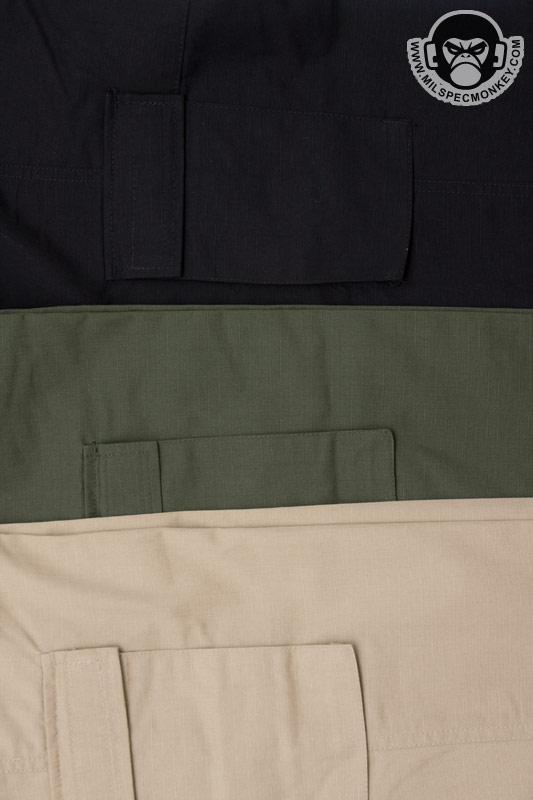 These pants are a nice variant from the TDU and BDU style pants. The main style is that of a typical cargo pant, but one of the features that makes it stand out is the slash / diagonal pockets on both upper front and back. This makes the back pockets very easy to get to and they are deep enough to fit a 30 round mag. The right back pocket also includes a nice big strap as a solid connection point for your small tactical goods. The belt loops are nice and wide and spaced away from the sides to give room for belt connections. Back to the front is a small d-ring and a flashlight sized pocket on the front-upper left.