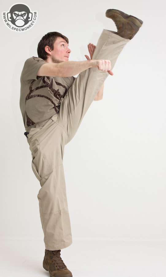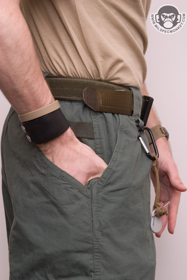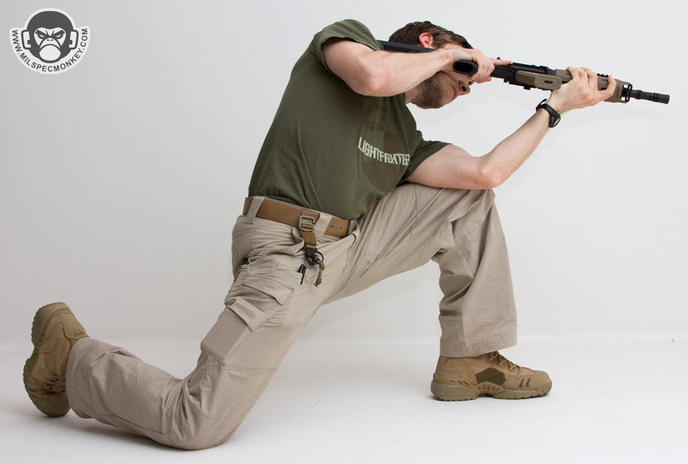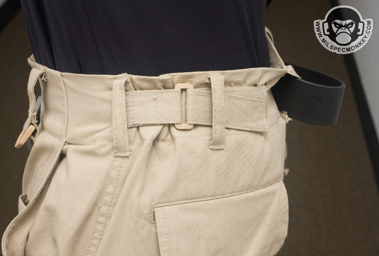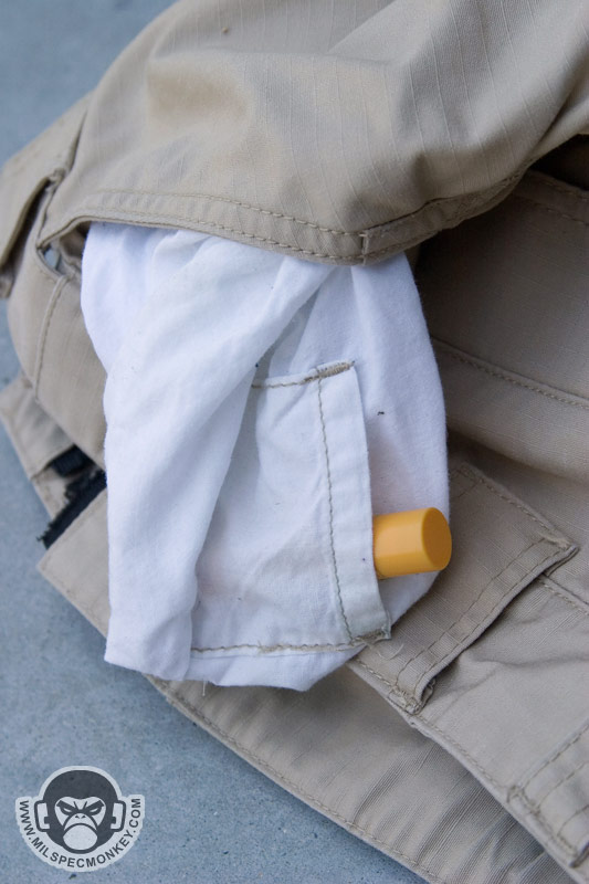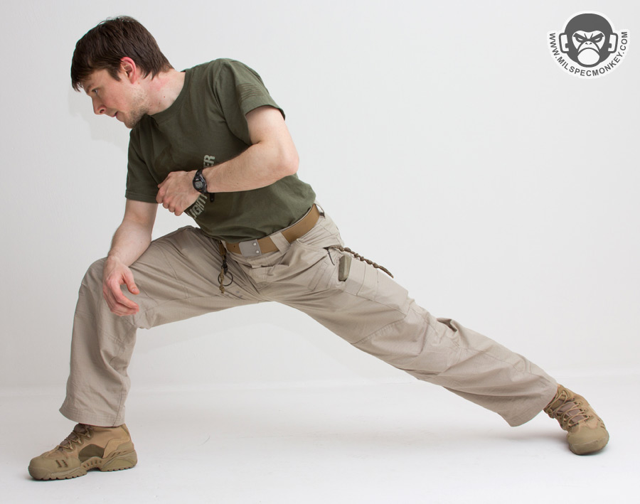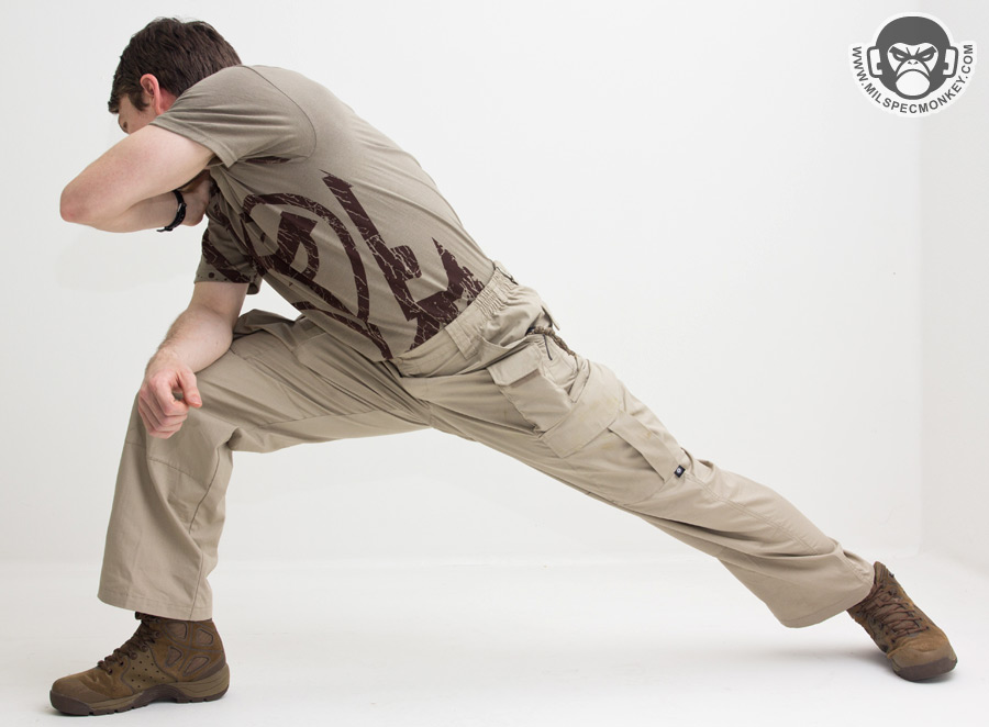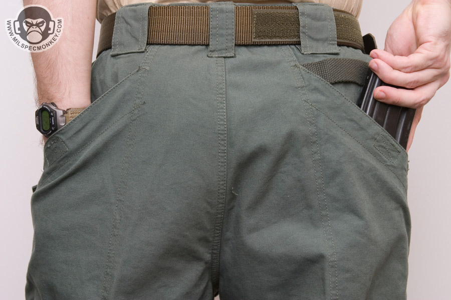 These pants are a nice variant from the TDU and BDU style pants. The main style is that of a typical cargo pant, but one of the features that makes it stand out is the slash / diagonal pockets on both upper front and back. This makes the back pockets very easy to get to and they are deep enough to fit a 30 round mag. The right back pocket also includes a nice big strap as a solid connection point for your small tactical goods. The belt loops are nice and wide and spaced away from the sides to give room for belt connections. Back to the front is a small d-ring and a flashlight sized pocket on the front-upper left.