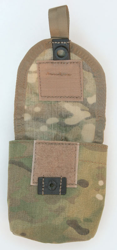 A straightforward design here, this pouch is meant to hold new and old military strobes, but can also be used to hold a fullsize compass. Flap secures with a SRB in which is traditionally sewn on for maximum adjustability. A grommet is located on the upper front of the pouch to allow cord connection for backup security of contents. The interior has a strip of black ballistic material to improve durability and water resistance. The back has PALS webbing to fit 2 short Malice Clips. Currently available in ACU, OD, Black, Multicam and Tan.