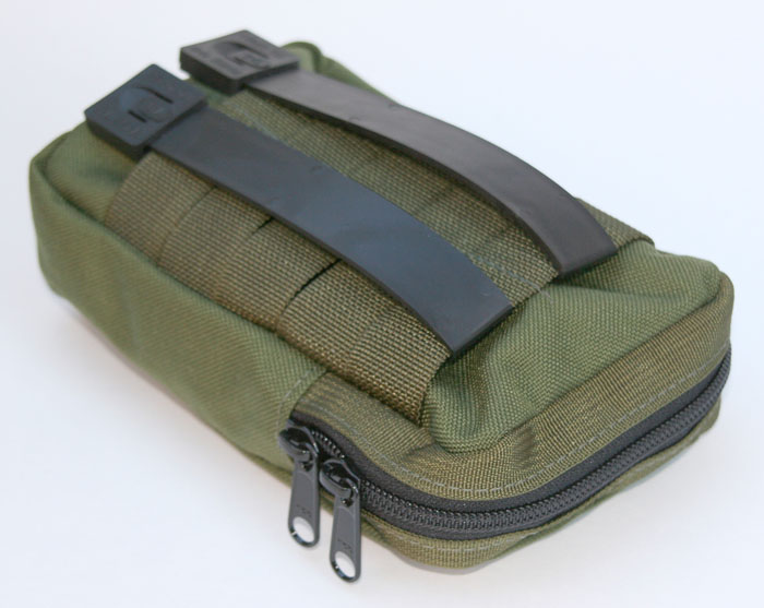 Notes: Simple and affordable pouch good for holding lighter items. Main construction is only of 1 ply of cordura. When mounted on one's side it can be a little hard to open if the zippers are towards your back since the pouch is so flexible. Malice Clips included.