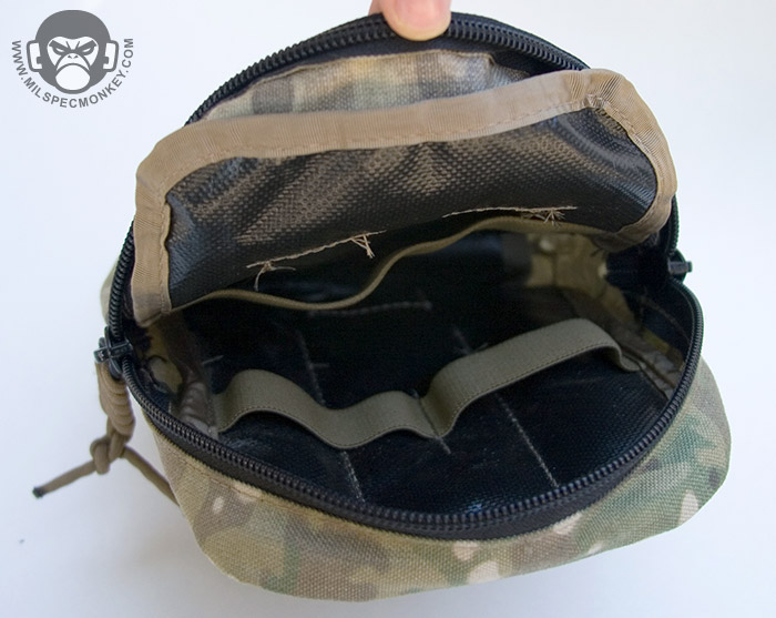 This pouch is intended to hold all the smaller survival gear one might need in an escape and evade situation. The exterior strip has a strip of loop velcro for ID / patches and the main functionality is a double zipper clam shell opening. Inside reveals many velcro sealed sleeves to include 5 internal pockets, clear window on main pocket, 4 elastic loops and a small velcro panel. Little 550 cord loops are added to the velcro seals to assist in opening.