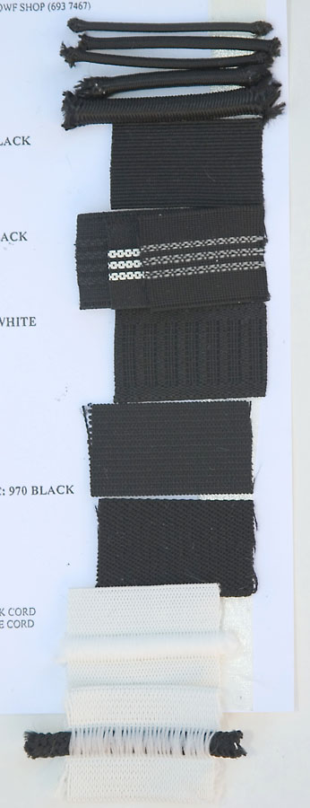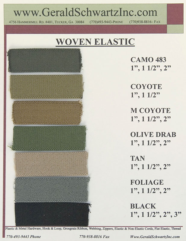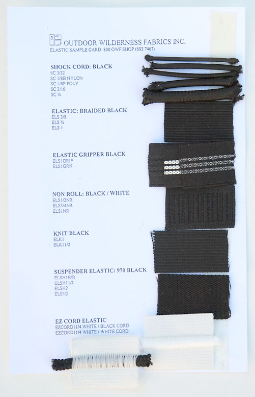 Outdoor Wilderness Fabrics Inc. elastics sample card. Non-mil colors however can see some differences between woven, braid, and knit.