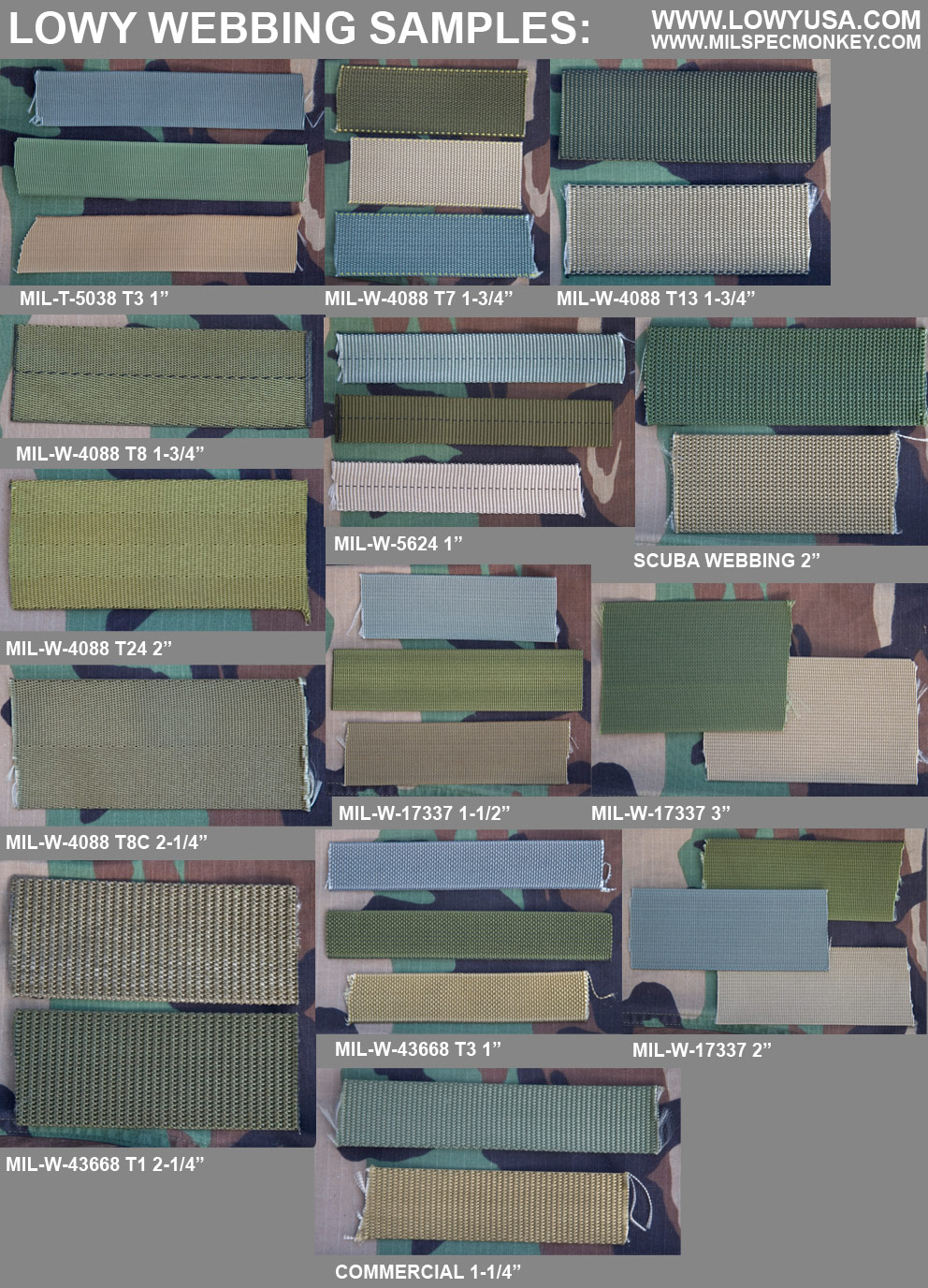 Lowy USA has a great webbing type and color selection including some of the harder to find webbings such as scuba and seatbelt types. The Coyote 43668 1" was a bit saturated/golden, but overall good stuff.