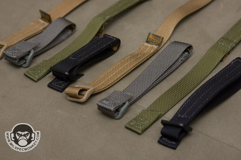 The TacTie is a pretty simple no thrills solution. Just webbing and a plastic tri-glide. The end is folded for security snagging, however cut at an angle to make weaving easier. Pros are that they are affordable, easy to weave, and very resistant to elements. Cons would be that the plastic hardware is a possible point of failure so I'd give them a medium security rating. I'll guess they are not made long enough to weave through both parts of the tri-glide (which would enhance security) to avoid sticking out a little from the mounted item. They come in 3" and 5" lengths which is the equivalent of Malice short and long. Available in Khaki, OD Green, Foliage, and Black to match the majority of kit.