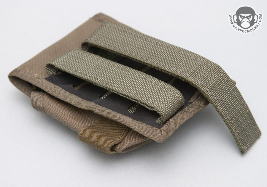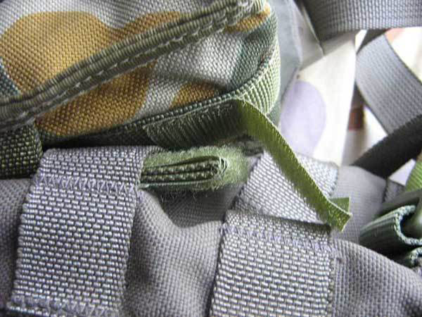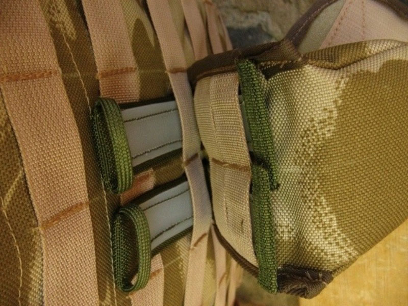 BFG took the velcro secured idea and enhanced the security level. The webbing layout starts similar to a traditional MOLLE Snap, yet at the bottom has a webbing strip that is hook on the interior and loop on the exterior rather than snaps. Once woven, the loop covered webbing tab is tucked under for decent constant pressure. For an important addition, folds are incorporated into the webbing straps to snag if the velcro seal is broken.