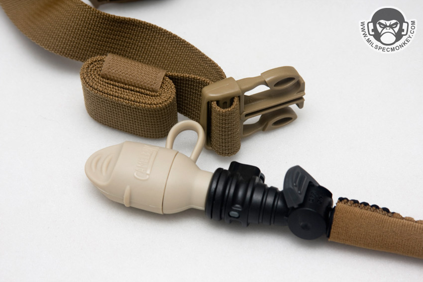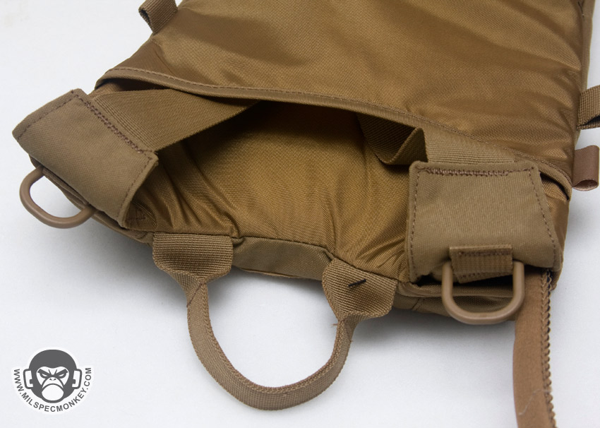 The OMEGA Water Beast 102oz Reservoir is included and fits in a crafty manner allowing the majority of the bladder to be covered, but the main opening is accessable under the flap. An adjustable webbing loop is even up top to secure the bladder on. The Big Bite valve and Hydrolink valve cover are fortunately included in the package. Most users will route the main tube through the upper left or right shoulder ports, however the lower sides of the carrier have additional port holes for more options. There is even a zipper down the side for quick internal access whether it be to adjust the bladder or toss in some scoobie snacks.