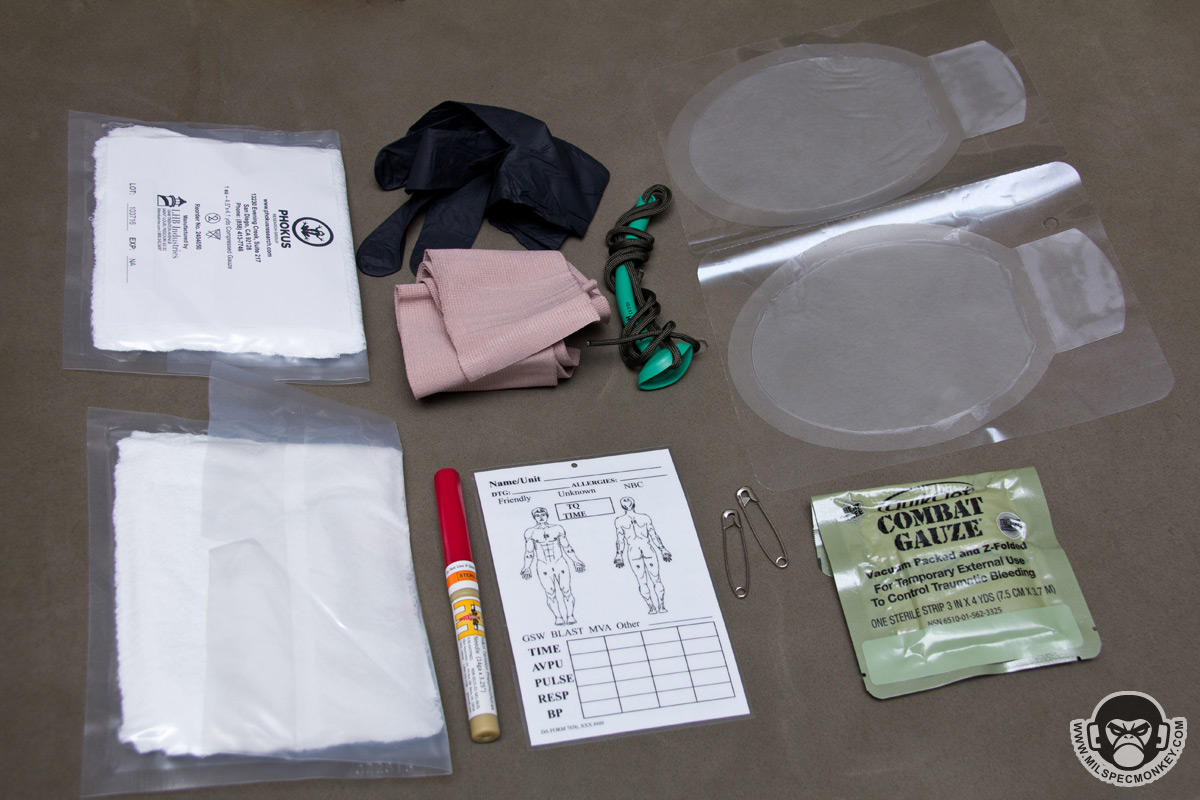 This is a pretty solid setup for stabilizing a gun shot wound and other wounds that are common with tactical dangers. Definitely noteworthy is there is no tourniquet so it appears on this loadout they assume the wearer will have one easily accessible elsewhere on their body. As another small detail the NPA comes wrapped in 550 cord, so you don't have to open any NPA packaging, but one will have to take the 550 cord off it before use.