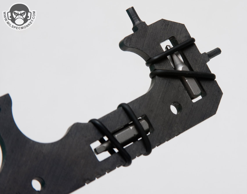 For change considerations I would be interested in seeing if a third bit could be held in the tool interior without degrading much strength. For something more drastic, perhaps the slots could even be adjusted to hold some traditional L-shaped Allen keys. Storage is somewhat of a concern due to all the pokey ends, so if possible I recommend placing in a slim sleeve-type pocket making the best use of the flat side of the tool. Tossing it loose in a bigger than needed pocket may cause holes over time. The ARMT is also claimed to be a good last defense fighting tool, which I find a little funny as that occasion would likely only occur if no other weapons are around and the enemy sneaks up on you while you are cleaning your rifle, however I will say the grip gives a combat weapon type feel that I don't think any other AR tool does. Despite the bands used are quality o-rings I will keep an eye on their durability since I see signs of wear on the edges of the one stretched further than the others. The ARMT makes for an a solid new AR tool option since armorer tools will be much larger and single-tool while the more traditional shaped folding AR specific multi-tools will be less rugged. Other than the usage of the bits, there are no moving parts so the core of the ARMT is quite battlefield durable.