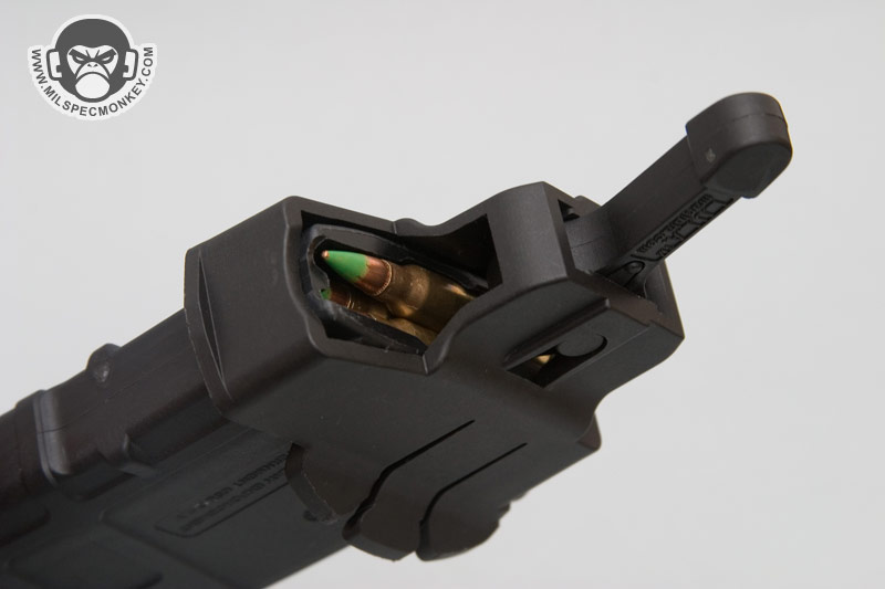 Since I was so happy with the MagLula, I had to try out the Lula. Rifle magazines are generally easier than pistol magazines to deal with, but the Lula makes then even easier. The way it works is you place the Lula on top of the mag with big opening towards the business end of the bullets. The lula will snap onto the mag catch for a solid connection. Now when moving the lever back and forth this will cycle between pushing bullets down on the right and left side of the mag. When pushed down this allows space for a round to be inserted. So when reloading: one angles the mag back for gravity assistance, puts in a round, cycles the lever, and repeats till full.