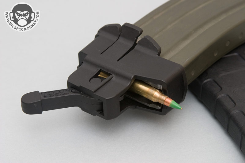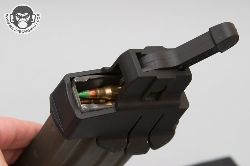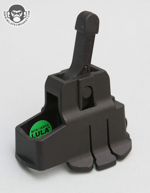 This isn't super fast, but is noticably faster than by hand and will keep the wear off your hands while protecting your feed lips on your mag. For unloading the Lula really shines. It may take a little fidgiting to figure out which way the lever needs to be to get started, but once going the bullets fall out as fast and one can move the lever. Just point the mag top down and go at it. The lever can be pushed down into the body for smaller stowage size and a keyring is standard on the back for an attachment point. The M16 / AR 15 version works on many NATO variants such as you can see on my pics, it fits great on Magpul PMags. Do note this model does not work on HK high reliability mags or SA-80 magazines, but a version is in development. For other weapons many Lula versions are availble as well such as for AKs, MP5s, Uzis, M14s, and more. Well worth the price, check out the site links for more intel.