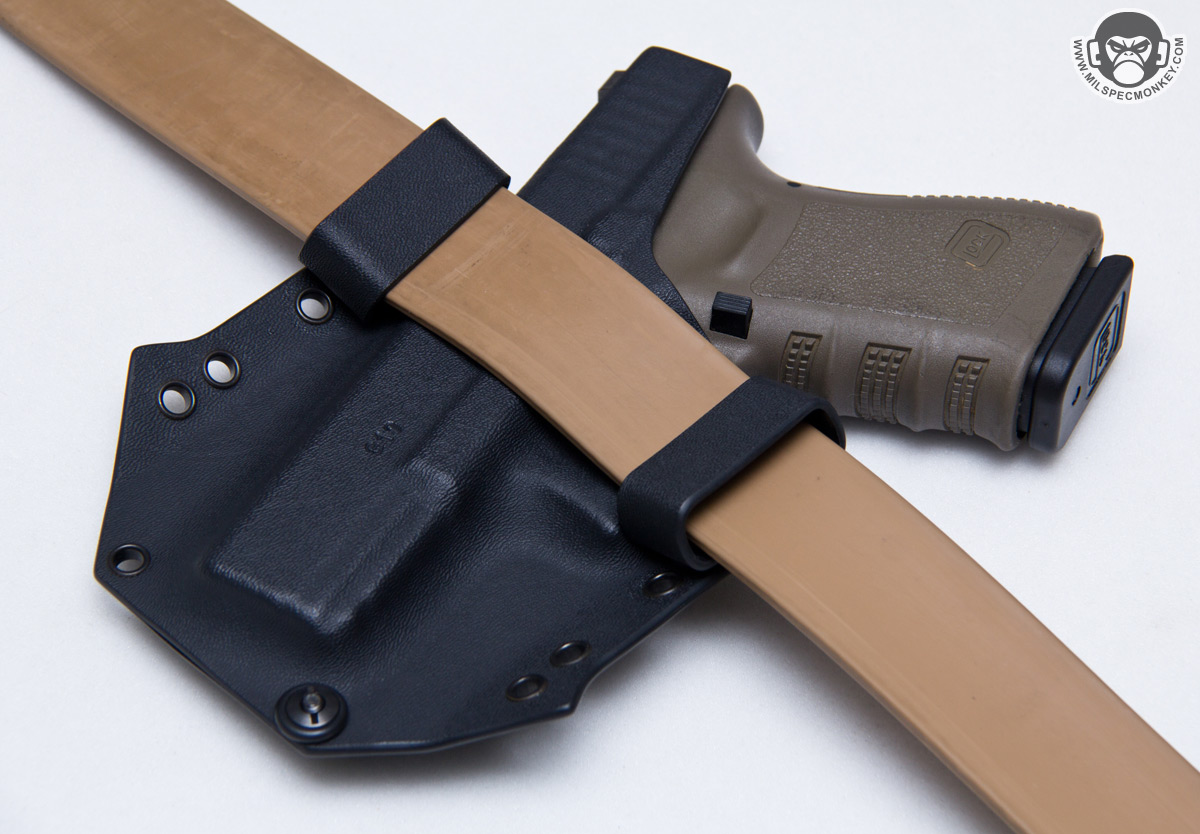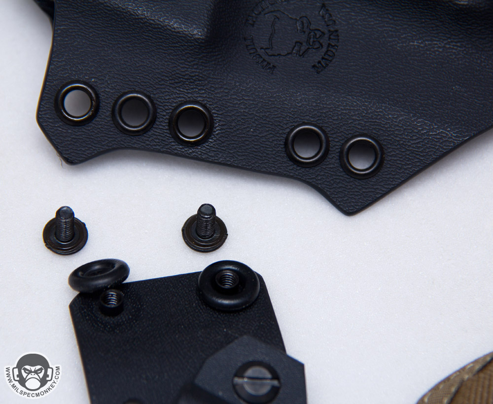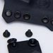 Small details count on kydex so it is nice to see all edges are properly smoothed out and good hardware is used. The screws interface with simple flat head screwdrivers so no wacky specialty tools are needed and coins will work in a pinch. O-rings are also included to add screw tension preventing unscrewing with normal wear and use. An extra screw set is even included which is a welcomed addition for creative mounting and backup hardware. I inquired what was the deal with the "spikes" on the sides and Pitbull Tactical confirmed they were for adding strength to stress points and a dash of visual sass. I was a bit worried they may create body poke points so luckily they haven't been a problem yet and I do agree they add some aggressive flair to the holster look. Thickness wise .06" kydex is used for the main construction which offers good flexibility comfort while the clips use .93" to reinforce the mounting points. These thicknesses match up well together since the holster is made up of 2 pieces while the clips are single piece based giving a consistent strength to the holster as a whole. The end result width is nice and compact with the bloodline series being one of the smaller footprint kydex holsters out there; making sure not to get carried away with getting bulky and overbuilt in a bad way.