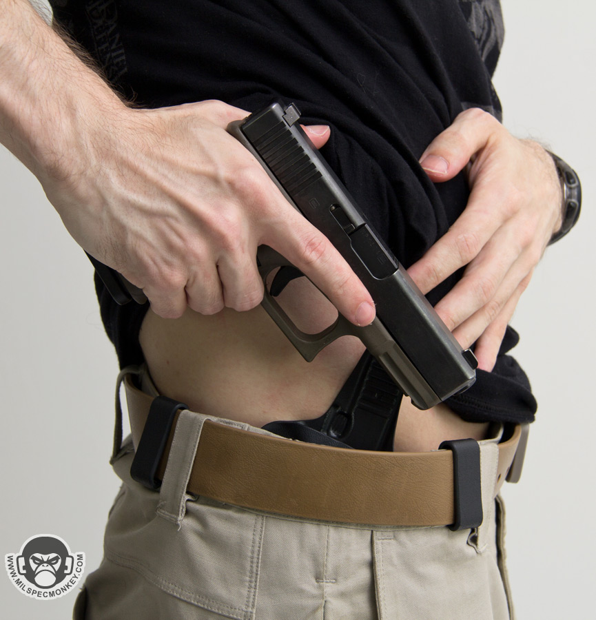 Position adjustments are made by simply moving the clip mounting locations around. The Wings optional hardware add even more adjustment flexibility and I think helps curve fit the holster to one's body better. The IWB clips allow for holster mounting and removal while pants and belt are already on while the OWB clips are close looped so a belt will need to be fed through. On the IWB clips I think the slot and hook sizing is a good balance. It can be tricky on how far to push the inner hook; if too far they are a pain to use and might as well be closed loop then if too stubby of a hook it can be a security issue where the clip can manage to slip off the belt. When it comes to holster position stability on a belt, the location of the pant belt loops and belt material tend to be a large factor, but I found the Bloodline non-slip qualities sufficient. Integrating non-slip material into the hooks could be a worthwhile idea, yet there are probably decent reasons why I have never seen it done before yet.