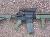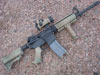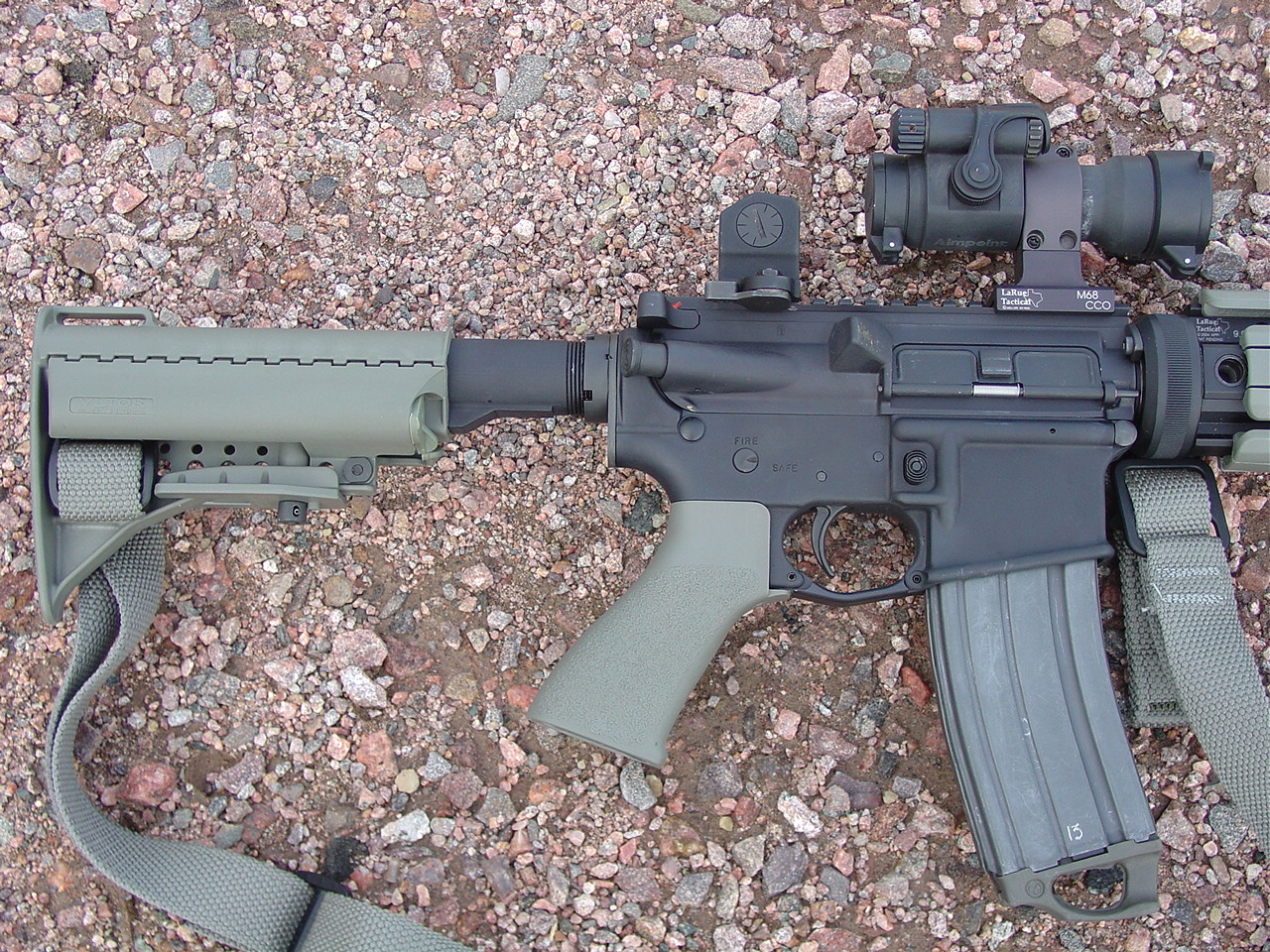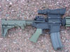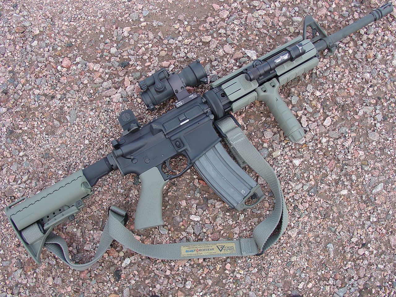 Stag Arms (with Sabre Defense mid-length barrel) Foliage Green Mid-Length. Mounts, light mount, optic mount, rail system, BUIS, etc are all LaRue Tactical. Rail pannels, pistol grip and vertical foregrip are all Tango Down. Stock is Vltor, and sling is Blueforce Gear Vicker sling. Aimpoint sight.