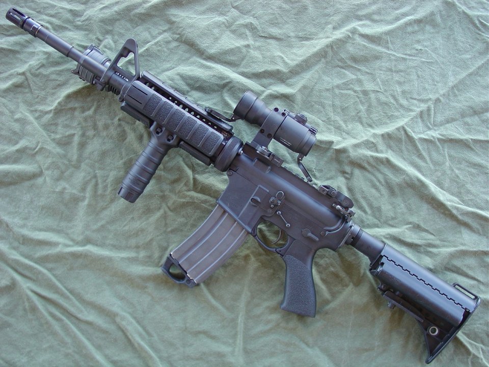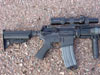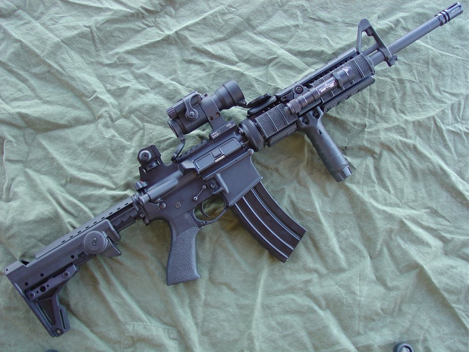Colt 14.5" M4 SOCOM (heavier profile) barrel with Sabre Defense elongated A2 flash hider, LaRue rail and Aimpoint mount, Troy BUIS, Vltor Stock, Tango Down vertical foregrip, Battle grip, and rail pannels