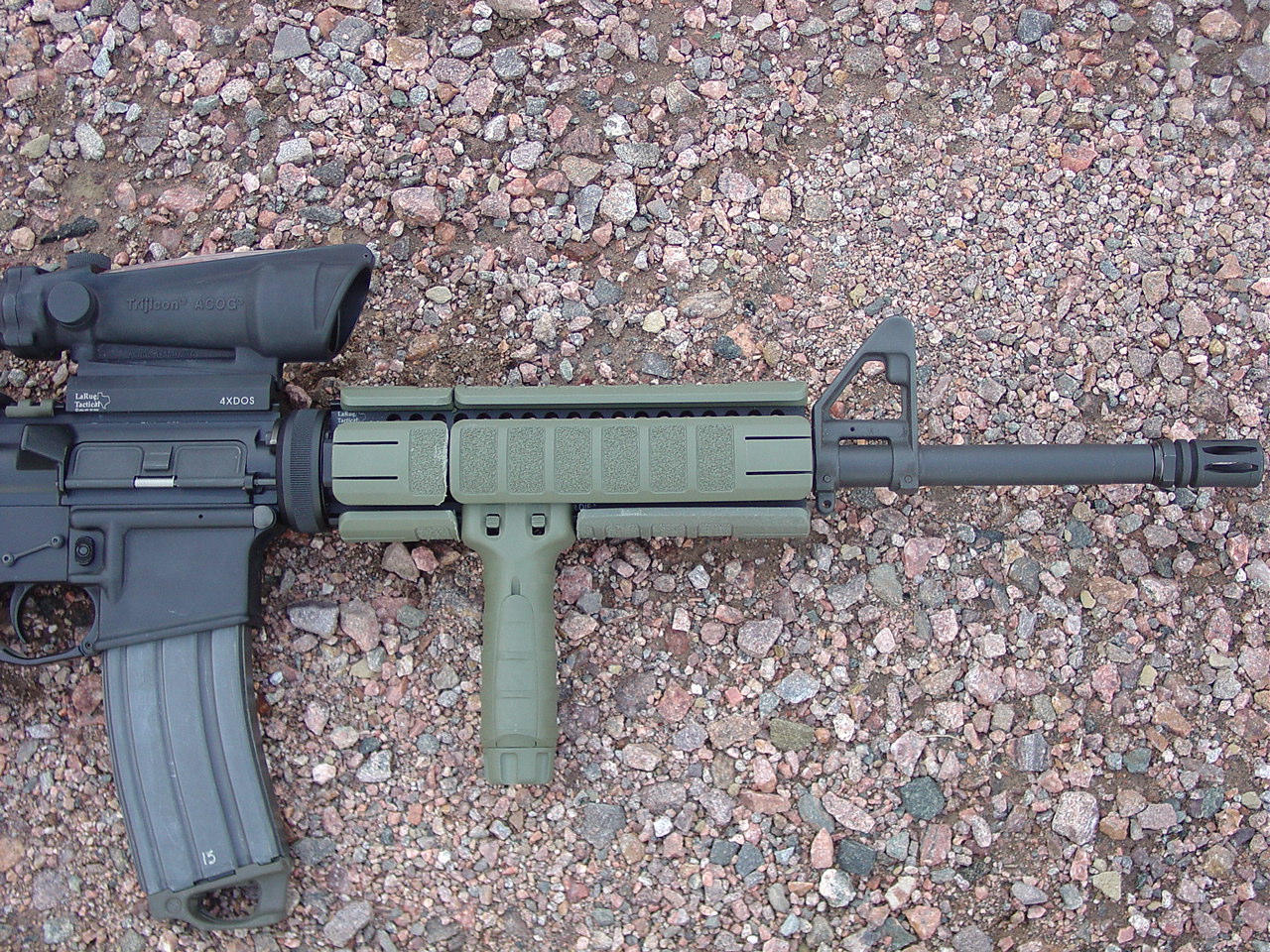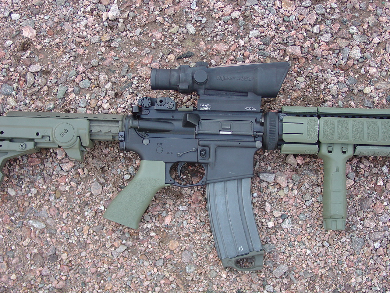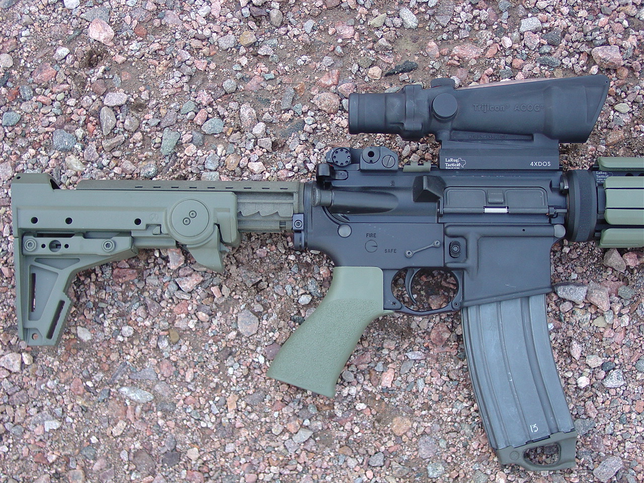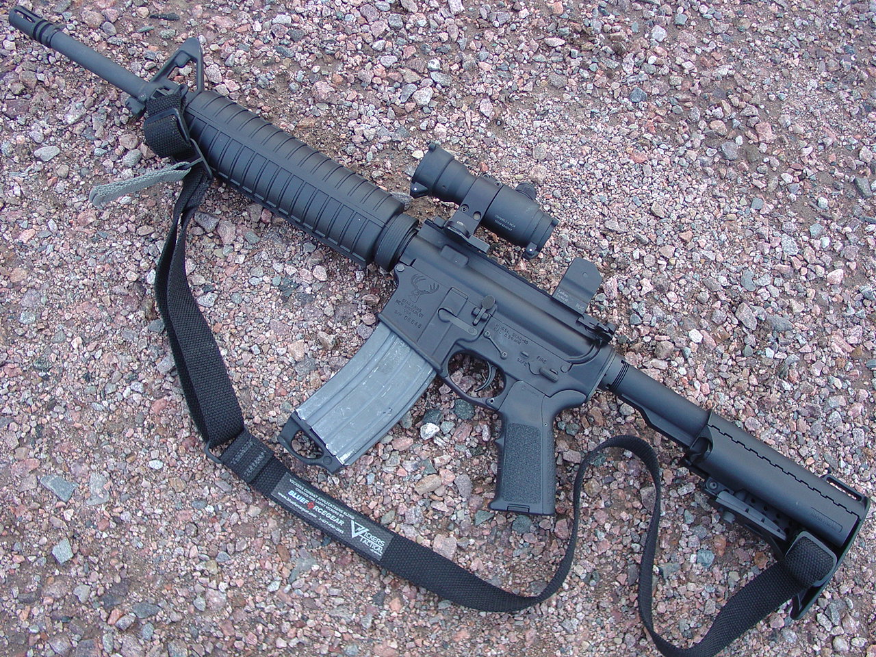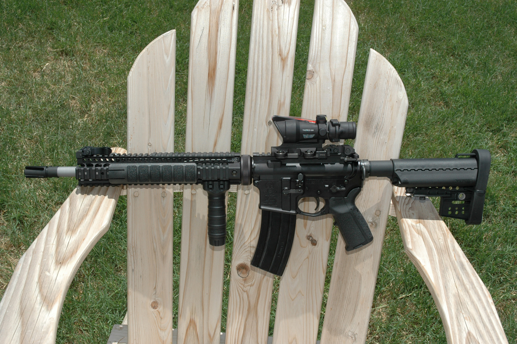 Complete Stag Arms (minus the barrel): Rock River Arms Chrome Lined Mid-Length barrel custom countoured to .690" under the handguards, LaRue 9.0 rail system, Tango Down rail pannels, Tango Down vertical foregrip, Trijicon TA11 ACOG, LaRue ACOG Mount, Troy Industries Dual Apeture BUIS, Tango Down Battle Grip pistol grip, KNS non-rotating hammer / trigger pin set, Magpul M93B stock, Magpul Enhanced Trigger Guard