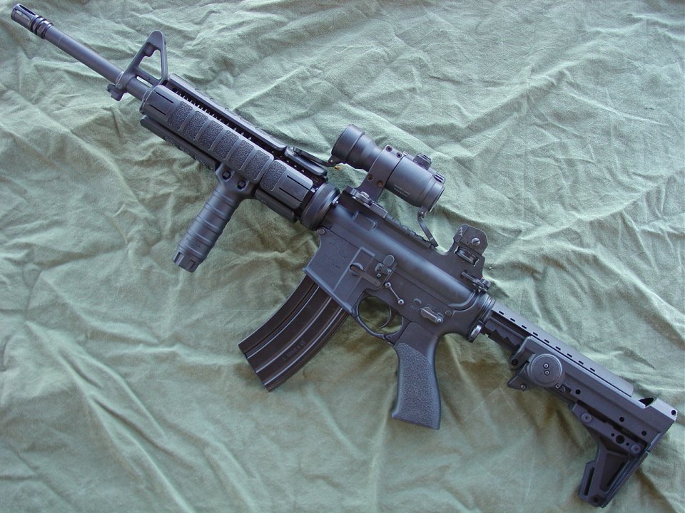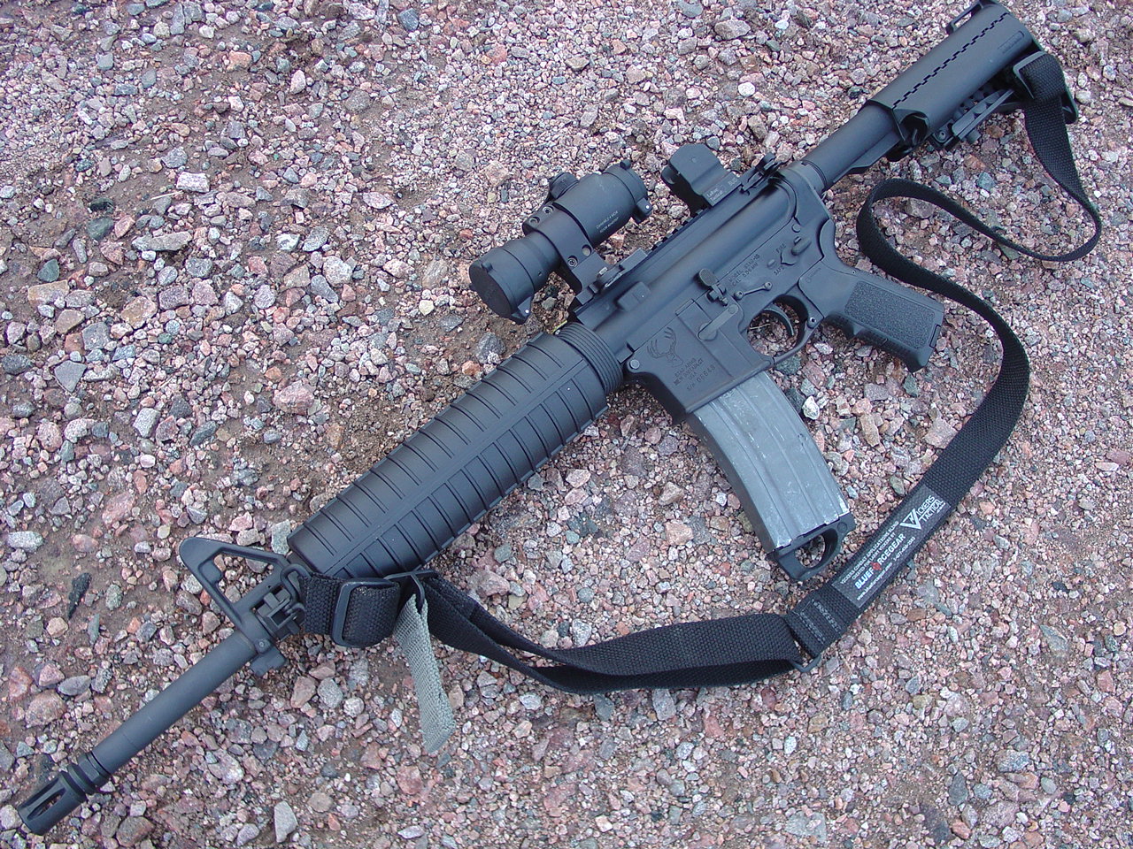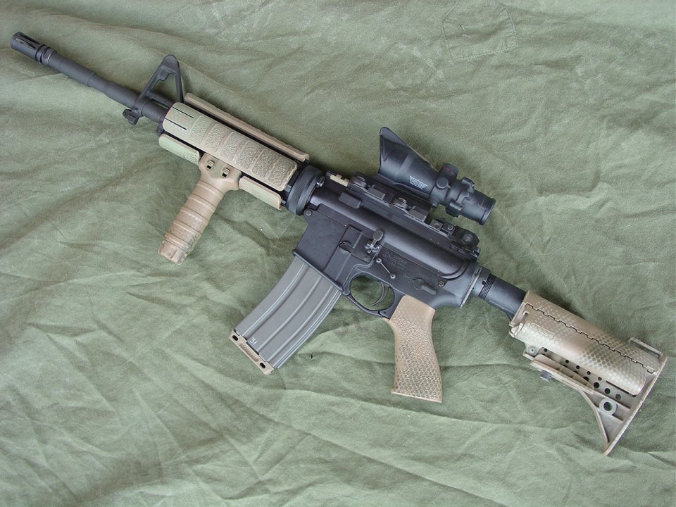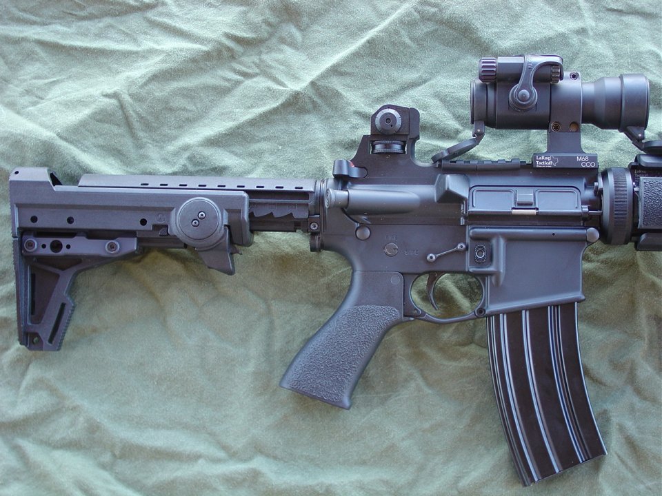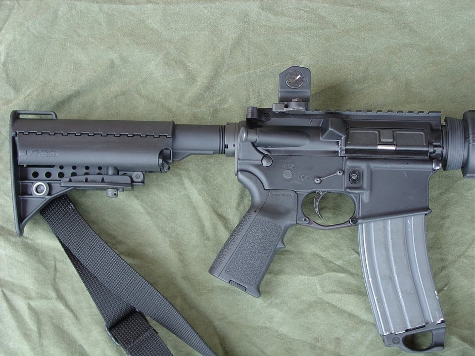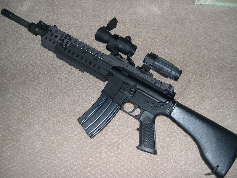 CHROME LINED Chrome Moly R-4 Barrel Assembly, 16 Inch CAR, Bushmaster Flat Top Upper, Oberland Arms Lower (with ambi safety), Battle Grip with Dacal Tape, RRA M4 Barrel with A2 style Compensator (a flashider is not allowed), Sure Fire M73 Handguard, Tango Down Vertical Fore Grip, Vltor Collapsible Stock Model# ACBK-2C, Spectre Single Point Sling, A.R.M.S #40 Flip Up Sight, ACOG TA01 NSN with JPoint Red Dot Sight, SLAP IR Laser:
