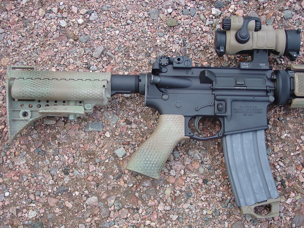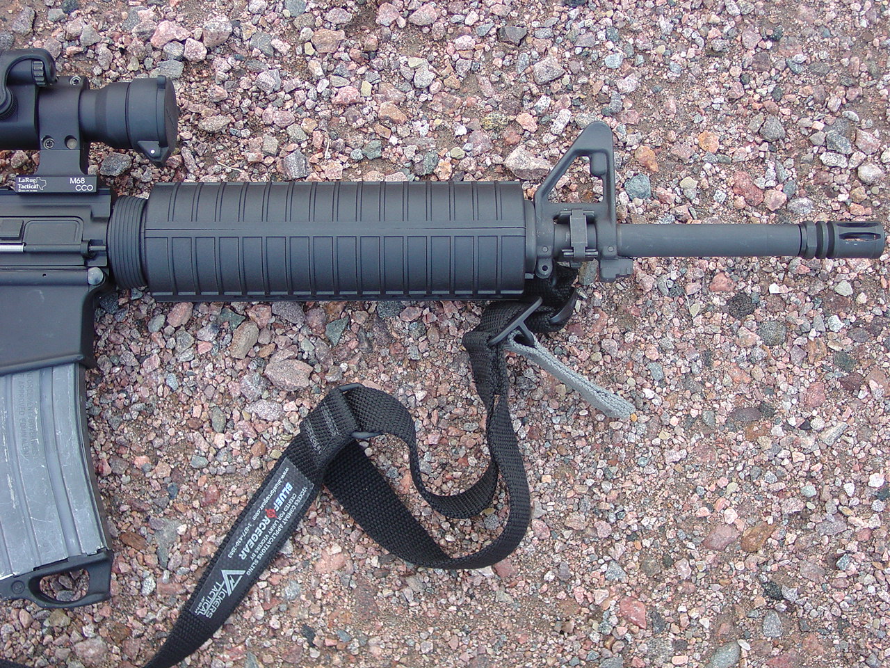 Complete Factory Rock River Arms: Rock River Arms Chrome Lined Mid-Length barrel custom countoured to .730" under the handguards, LaRue 9.0 rail system, Tango Down & Magpul XT rail pannels, Tango Down vertical foregrip, Aimpoint ML2, LaRue Aimpoint Mount, Tango Down Battle Grip pistol grip, KNS non-rotating hammer / trigger pin set, Magpul M93B stock, Magpul Enhanced Trigger Guard, Surefire Scout Light, LaRue Tactical Scout Light Mount