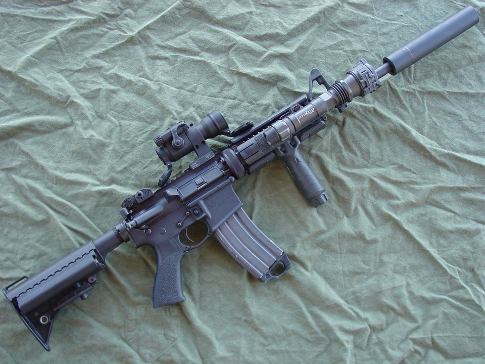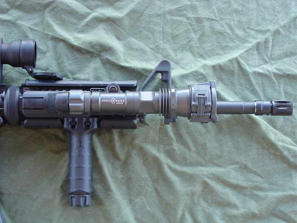 C-Factory Colt LE6920: 14.5" Colt M4 SOCOM barrel, Gem-Tech Bi-Lock flash hider perminately attached, LaRue 7.0 rail system, Tango Down rail pannels, Tango Down vertical foregrip, Aimpoint ML3, LaRue Aimpoint Mount, Troy Industries Dual Apeture BUIS, Tango Down Battle Grip pistol grip, KNS non-rotating hammer / trigger pin set, GG&G single point sling plate, PRI Gas Buster charging handle, Vltor stock, Magpul Enhanced Trigger Guard, Gem-Tech G5 suppressor (Gem-Tech conversion from a M4-96D to G5)