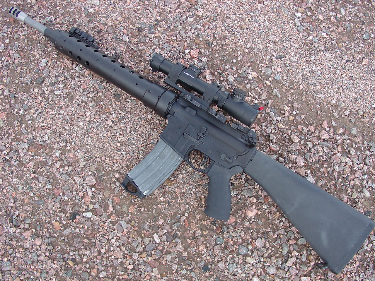 All RRA, with White Oak Armament 18" SPR barrel, MSTN QC comp, LaRue Tactical Gas Block, LaRue SPR mount, Leupold MRT M2 1.5-5x scope, PRI Gen III fore end, front and rear Troy BUIS, Magpul trigger guard, rubber ERGO grip.
