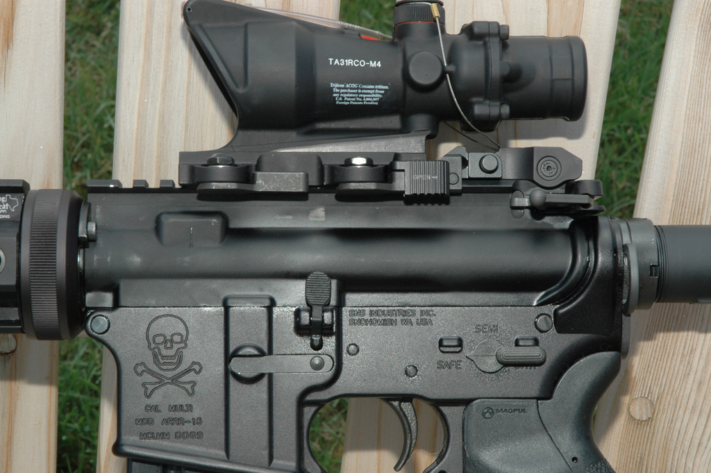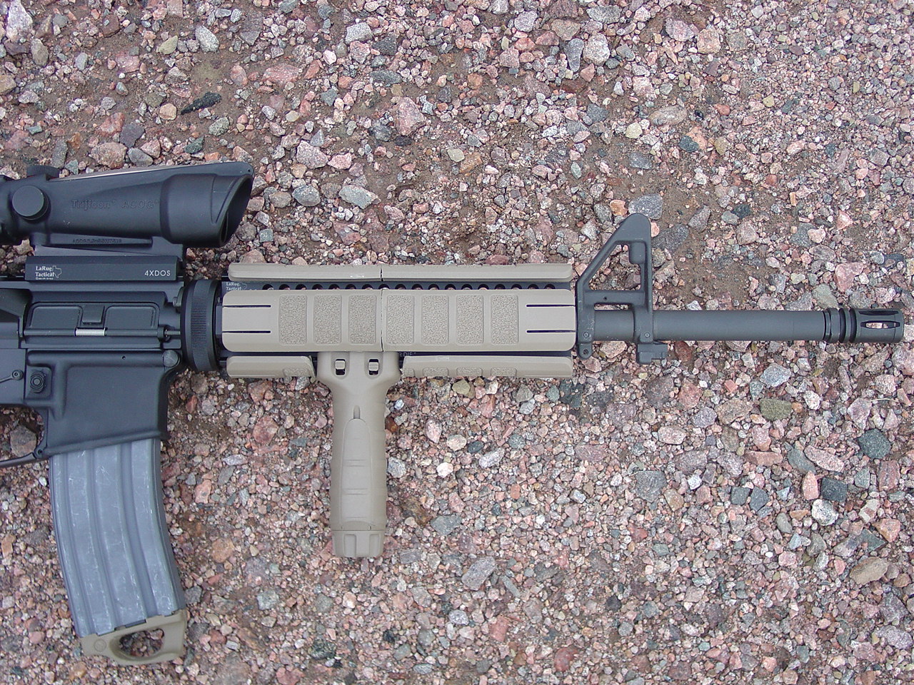 Complete Bushmaster (minus the barrel): Armalite Chrome Lined Mid-Length barrel (gov't profile), LaRue 9.0 rail system, Tango Down rail pannels, Tango Down vertical foregrip, Trijicon TA11 ACOG, LaRue ACOG Mount, Troy Industries Dual Apeture BUIS, Tango Down Battle Grip pistol grip, KNS non-rotating hammer / trigger pin set, Magpul M93B stock, Magpul Enhanced Trigger Guard, Spectre Gear Universal 3 point sling