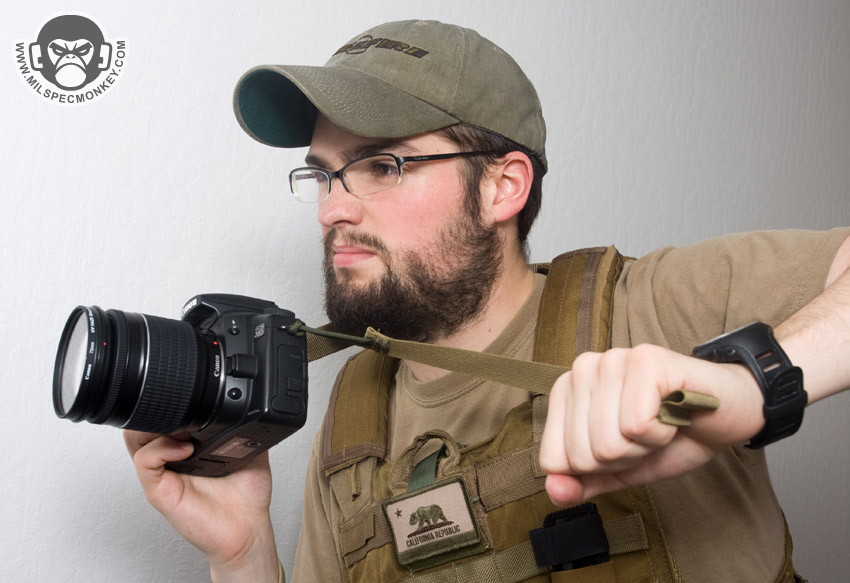 This is a simple and effective strap for your fancy camera or pair of biznocs. I'm a camera totn' dude, I mostly use it for that. To mount, the strap has 550 cord ends to go through the strap mounts. Since mounts are pretty slim on the cameras, I was thinking "good fucking luck!" at first, however was able to ram the cord on through with some poking effort. This is a security bonus since most straps have little ladders or triglides for mounting which can break or loosen.