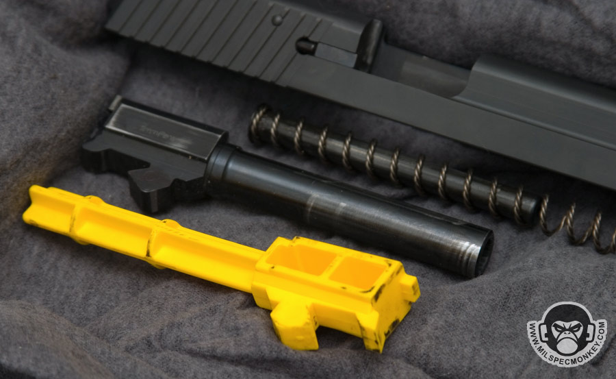 This is a straight forward item that assists in training safety and identification. To install ones just breaks their gun down and replaces their real barrel with this one. No tools or wacky techniques are required further than what your weapon already required. Once in, there is no way for bullets to be chambered so the weapon is completely safe even with live magazines inserted. When in normal slide forward mode, the training barrel can easily be seen with all of its bright yellow glory in the ejection port area and muzzle end. Alternatively, when the slide is back, more of the barrel is visible while the ejection port yellow can only be seen from the rear.