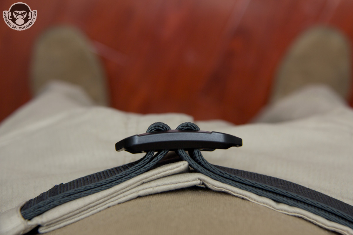 When it comes to simple webbing belts the small details are going to be the main things to look for and this series does include some nice touches. For starters a custom polymer buckle is used; the shape has a nice modern angular look while not sacrificing functionality. The thickness is appropriate for long term durability without being excessive and the side protrusion helps with angling the buckle for aid in adjustments. Although the hole is probably just for weight reduction, one could even add cord to the hole for even more adjustment grip options.