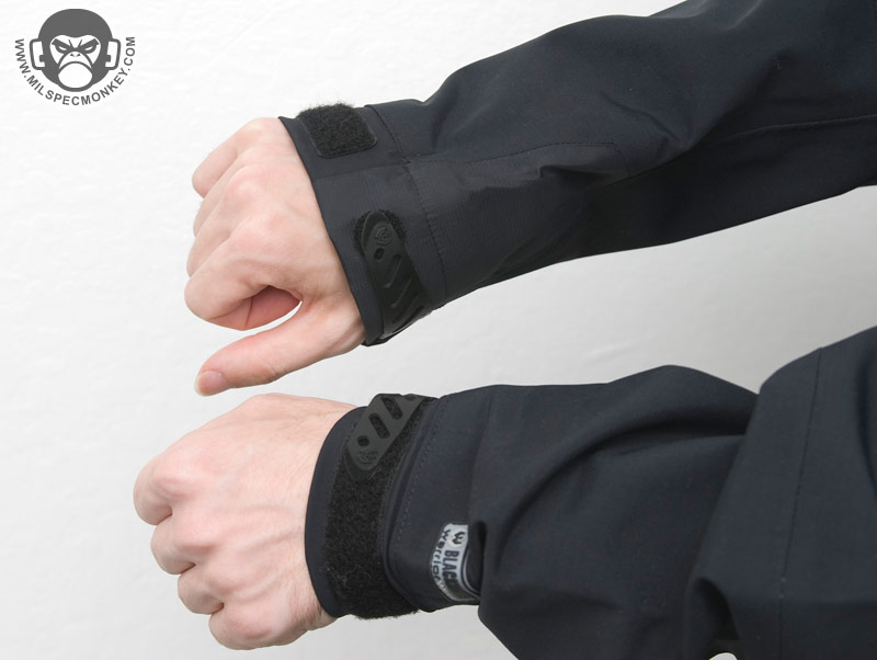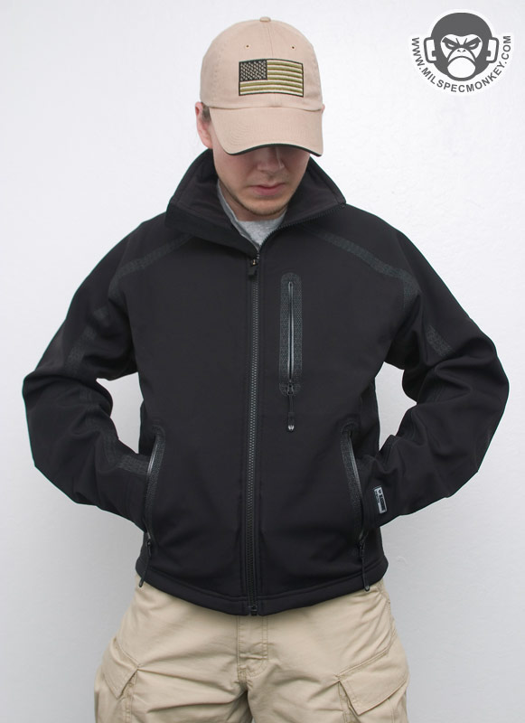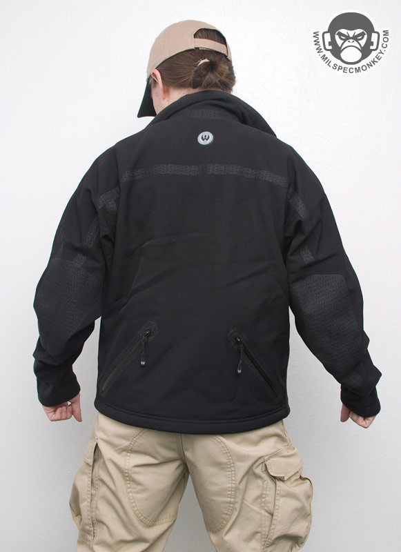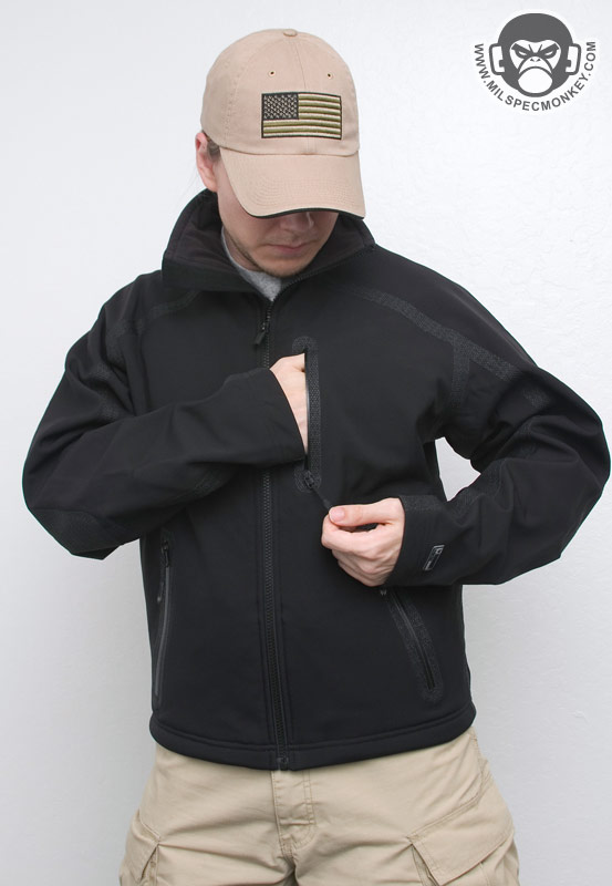 The meat of the jacket system is layer 2, The Ops Jacket. The sizing and thickness is what most expect out of a medium jacket, but it has additional element protection and features. I'm not sure what the main shell material is, but Blackhawk calls it a Durable water-resistant (DWR) soft-shell. All of the outer seams have been sealed by being covered with textured non-slip material and a large batch has been added to the elbows for added durability. The interior is made up of a combination of fleece/tricot and soft mesh to give warmth yet ventilation as well to the right places. The main zipper is that sweet semi auto locking kind as seen on the training jacket. I wonder about how long it will keep its spring/lock ability, but worst case it just becomes a regular floppy zipper. The other external pockets all have waterproof sealed zippers which have little metal tabs and pull cords including custom textured warrior wear tabs. The indented tear-drop shape of the pull tab makes a nice intuitive grip. Symmetrical pockets include 2 side hand pockets, 2 lower internal pockets, and 2 zippers open in the back exterior for access to the same pocket to create a "tailbone" pocket. Inside the hand pockets are convenient shock cord pull tabs so the waist can be be easily cinched. This can later be adjusted with the tiny cordlocks that control the shock cord located at the lower front interior of the jacket. The waist cinch system is separated by grommet holes keeping the pull tabs and cord-locks in place so you don't have to worry about their placement shifting. For asymmetrical pockets there is one on the upper front left externally and slightly lower internally. Just for clarification the would be the left hand side of the user. I can only guess these pockets are only on the left side to be setup for right hand dominant use and leave the right side area more clear for firearms. Either way, I wish the pockets were on the right side as well. I don't think they would get in the way and would give more organization while delivering ambidextrous functionality. A good sized loop is under the tag for hanging of the jacket. Overall feels nice, great performance for its weight and thickness while looking sharp at the same time.