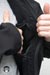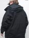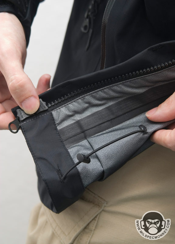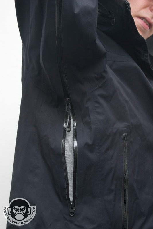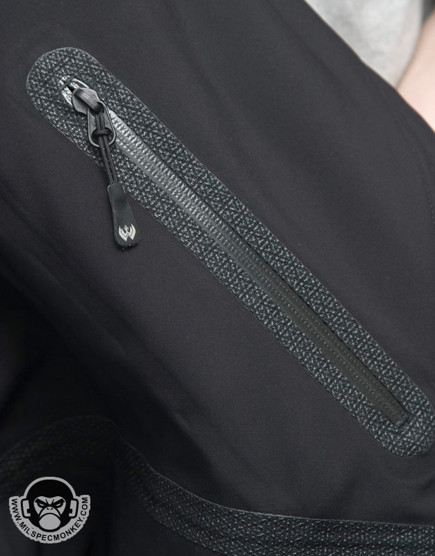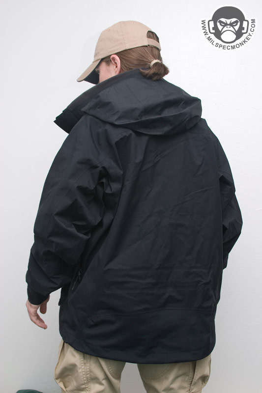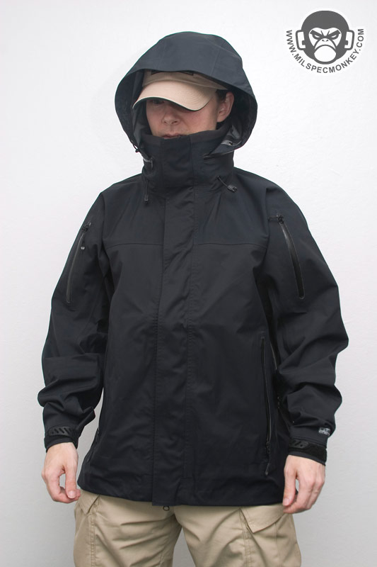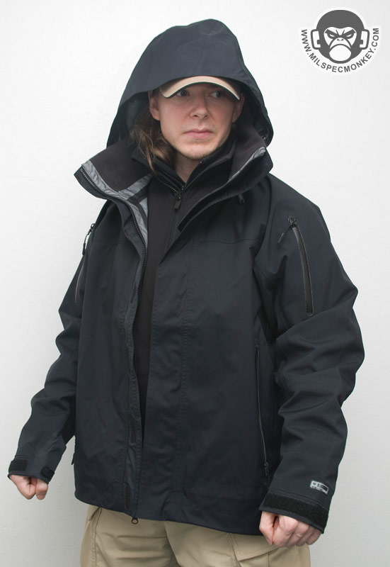 When you know the weather is going to be the suck, this is when you want layer 3. The Element Shell is water and wind proof based on a breathable 3-layer laminate hard-shell. All seams have been sealed internally to insure the water-proof performance. External pockets include 2 large side hand pockets and 2 shoulder pockets. Each pocket has water-proof zipper seals and use the nice custom zipper pulls as seen on the ops jacket. The same zipper setups, except with double sliders, are used on the sides for long pit-zips to allow easy ventilation control. Only the upper slider comes with a zipper pull so if one finds themselves preferring to unzip in a up to down motion, the pull can be removed and installed onto the lower slider. The main opening of the jacket uses a dual-direction zipper which is then made weather-proof with a flap that stays in place with velcro. Many areas include shock-cord and cordlock setups which are at the waist/tailbone area, the frontal bottom, and in the hood on both the opening compression and horizontal "headband" compression. The headband and tailbone cordlocks are a little harder to get to since located on the exterior and interior back sides respectively, but their existence is appreciated for adjustability. Another cool thing about the hood is that the upper back of the jacket has a built in pocket where the hood can be stored when not in use. This is much nicer than having a hood flop around when you don't really need it. As you may have guessed, deployment of the hood from the pocket is easier than stowing which requires taking the jacket off to do effectively. The collar area interior has a nice patch of fleece for comfort making this be the only area one might need to worry about getting wet. Even if a full interior drenching somehow occurs, the fleece is thin enough to dry reasonably fast. The cuffs are adjustable using loop velcro and rubbery straps with velcro compatible hooks built in. The velco dot is good for holding the straps when full hand opening is desired and the longer velcro strips allow the cuffs to be tightened on up. I like the rubber straps since they appear durable and conform to the arm curve. Since there isn't additional padding, the Layer 3 Element shell isn't made for the harsh cold, however it makes a great shell ready for adventures including hurricanes. Don't forget, what Layer 3 lacks in warmth can easily be solved with layers 1 and 2. When combined you got yourself a mean cold and water fighting jacket package.