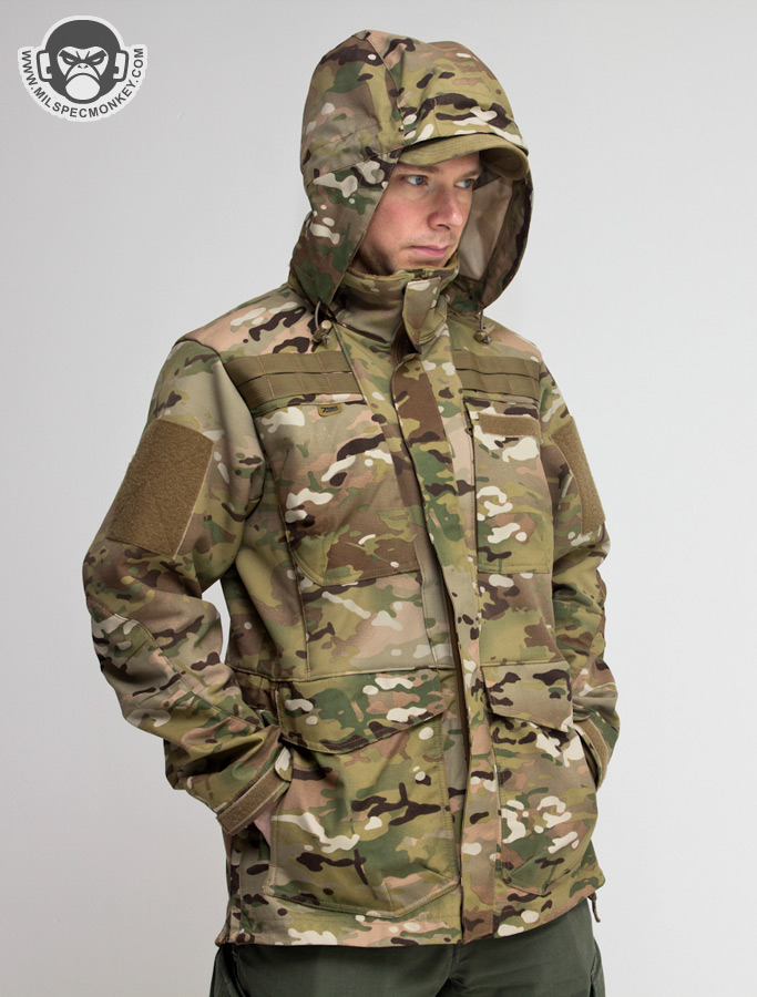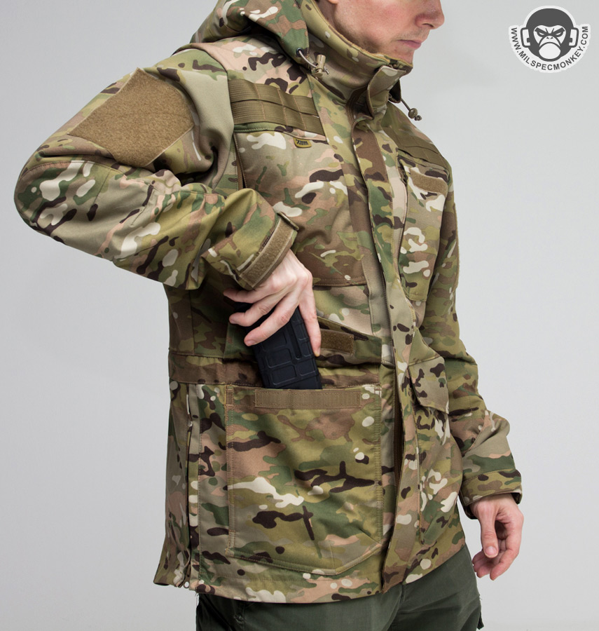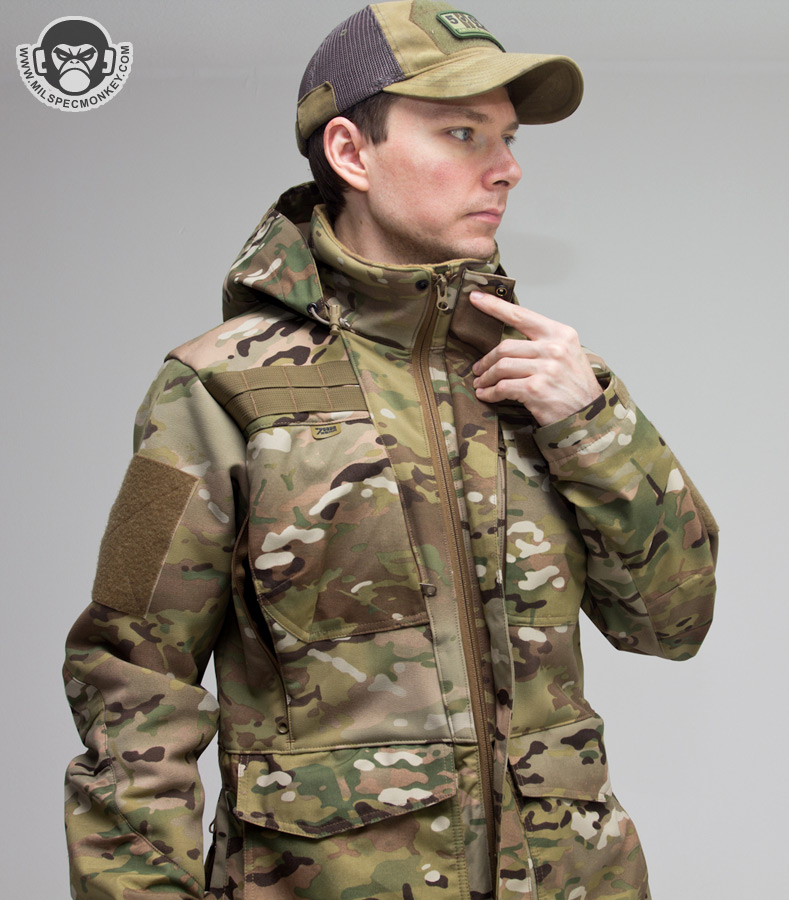 Core fancy materials appear to be: 3-Layer Gore Military Fabric, Tweave 4-way stretch softshell with DWR, and Polartec Power Stretch fleece. The wind and rain protection is certainly there, however the material type layout and vent features allow usage like a light jacket as well. Once down to near freezing or below, layering will likely be desired to stay warm. On that note the fit is overall loose which makes it easy to layer or wear with most tac-gear. Another big plus to the fabric choices is that there is a lot of give and stretch. In my past experience, similar jackets felt a lot more rigid giving off that "I'm in a plastic sack" kind of feeling. Thus the stretch mobility of the Rogue Parka makes it great not only for hard use movement, but for comfort on casual wear too.