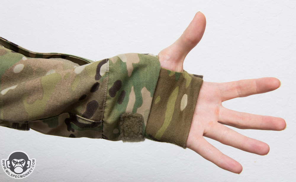 The cuffs sport a nice wide velcro strap for solid adjustability and interior cuffs to offer a good fit with protection from the elements. When not wearing gloves, the interior cuff even has thumb holes which help for both sleeve anti-twisting and partial hand coverage options. It would be safe to say with all these sleeve features it would be very difficult to try and roll up the sleeves, but no complaints from my white ass that needs to stay covered up anyway. Comfort wise between the shoulder construction and articulated elbows, the freedom of movement is great. The classic test doing the "hulk" or "fat man in little man's coat" movements is where many other designs will start to feel tight around the shoulder blades. An upward elbow strike is another good one. Some slight resistance is felt on the Tac-U shirt, but fortunately the stretch in the materials makes it very minimal.