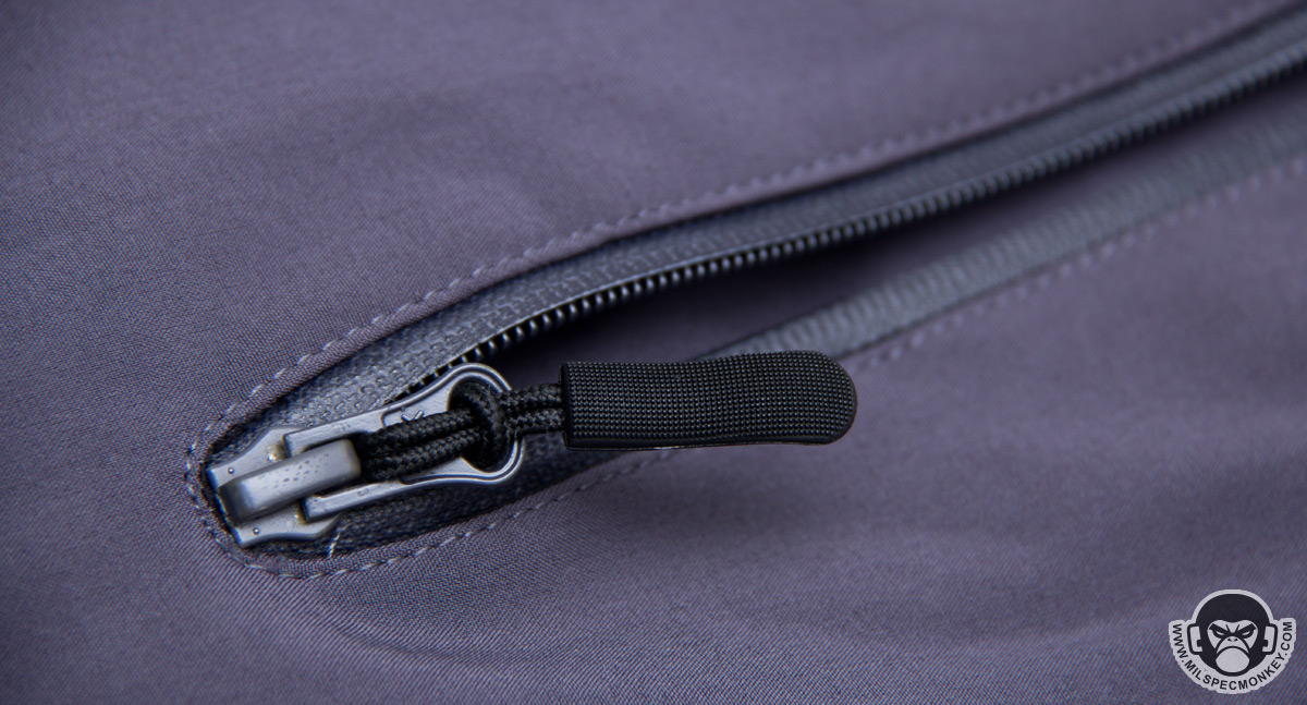 Vertx certainly didn't skimp on the weatherproofing for the zippers which can be a double edge sword. This makes them weather resistant, but also makes them difficult to zip back up. The bicep zippers in particular force one hand operation due to position, and then there is so much resistance to the zipper that one needs to slowly walk the zipper up using fingers to push or give it the ol' stiff arm trick by grabbing the jacket cuff in one's fist to add fabric tension. Thus the chest and hand pocket zippers tend to be easier to manipulate as there is the option to use both hands. I was pleased to see the pocket layout is symmetrical so no particular side is jipped. They also didn't skimp on the zipper pulls as nice rubbery / grippy ones are used for all core pockets and a unique plastic logo pull is used for the main zipper.