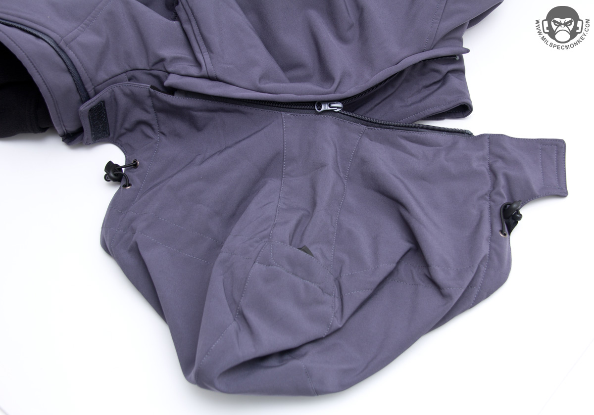 All the usual fancy jacket options are there as expected, such as having a hood included, many zippered pockets, and adjustable corded hem. The hood is removable with a simple and effective zipper and has multiple forms of adjustment using a shock cord and cord lock setup to cinch down to one's head shape. By default I found the hood worked with a ball cap fairly well. The neck wrap of the hood uses a simple velcro closure, which is fine, but I wish an extra piece of loop velcro or flap was included to cover up the hook side as it can make noise and generally be abrasive to the jacket.