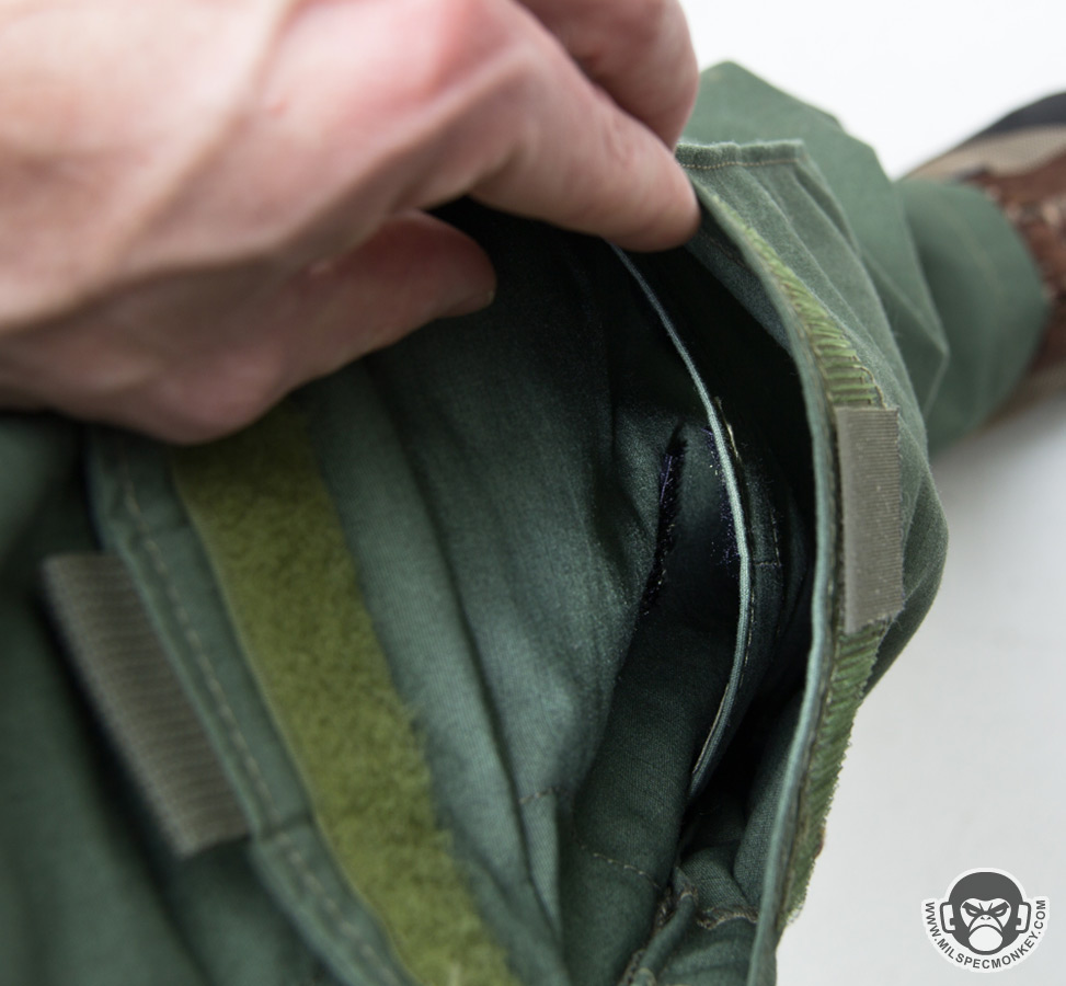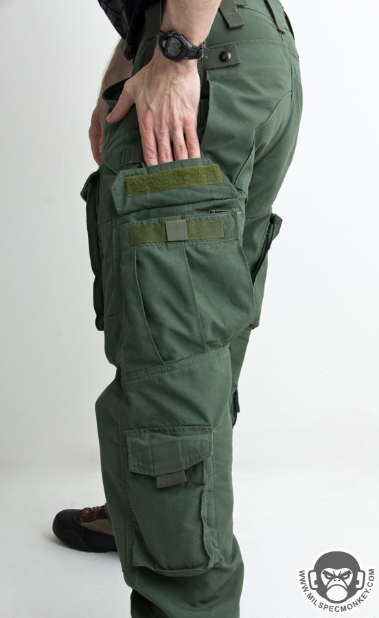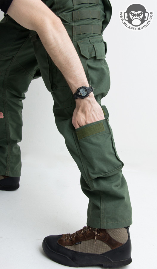 As expected there are also good sized cargo pockets, they happen to be positioned a little further back than most pants with the bottoms near the knee bend point being about the norm. By default they already have a good amount of billow potential and can billow out even further by releasing the side snaps. I added loop velcro to the hook on these pockets as well for one handed ease. I like how the flaps have their own grip pockets to give a positive opening and also are different than the thigh pockets which use more of a pull tab. Since tactical situations can cause one to get in some wacky positions, it is nice to be able to confirm which pocket is which by only touch.