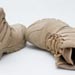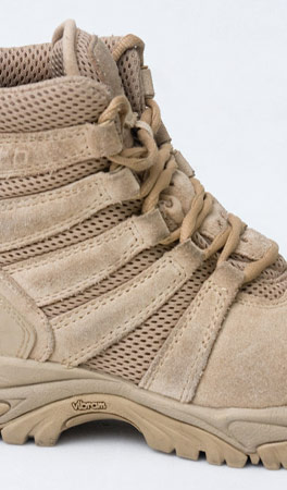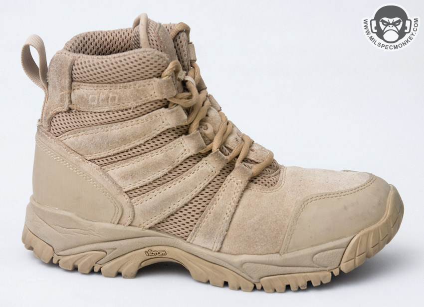 The foundation is a high traction non-squeak Vibram outsole and midsole unit. This provides a solid combination of traction and cushioning. Sometimes it is described by OTB as "sticky", but as you can guess that just means it has a good grip and doesn't collect filth. Inside is a composite shank for support then a dual density Ortholite cushioned footbed with Drill-lex looped wool lining for increased wicking and foot comfort. Starting with a Euro style outsole, the rest was adapted to create a warm weather tactical boot. The majority of the upper portion of the boot is a large mesh quarter panel with leather reinforcements for cooling. This tan version uses stain resistant cow suede for the leather areas. I haven't been in 120 degree heat or anything, but so far I find the Bushmasters to be quite breathable on hot days. In the spirit of climbing and general operator rough housing, the toe and heel areas have been reinforced with rubber material for durability and grip.