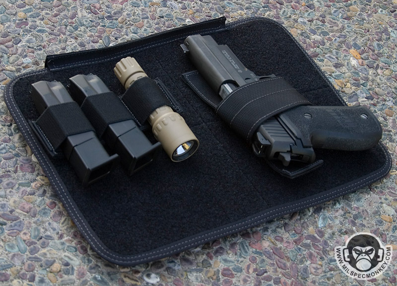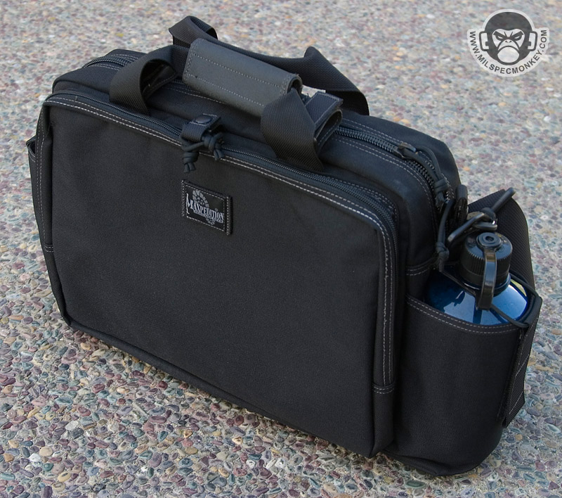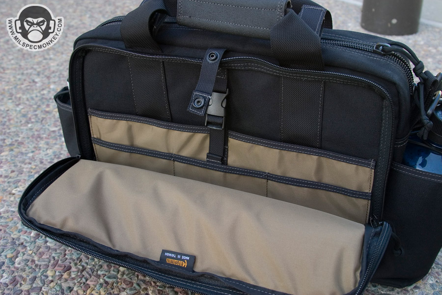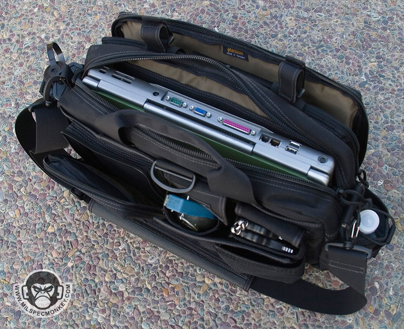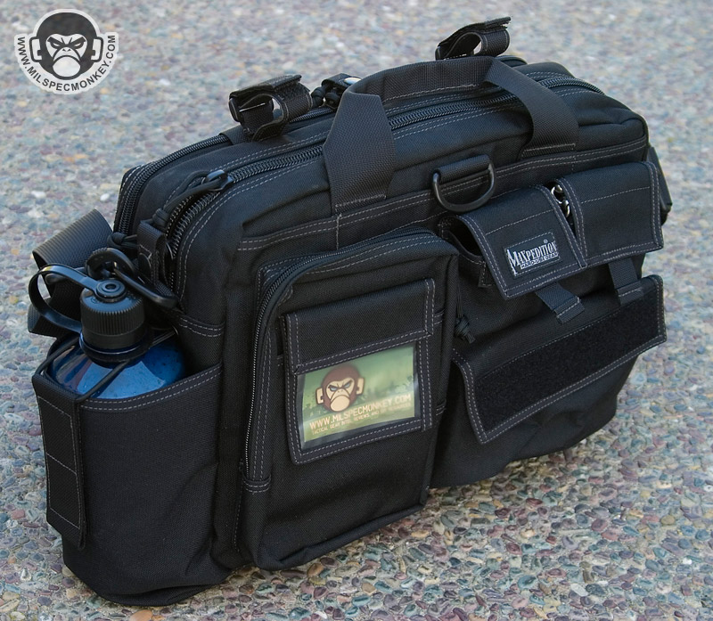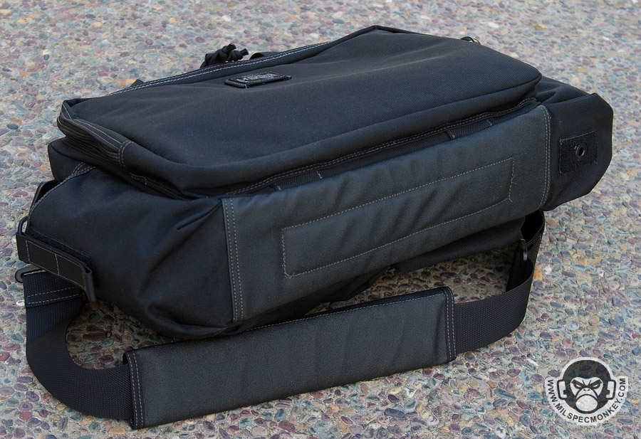 This bag is similar to the MPB, but is geared more towards tactical needs. One side has multiple pockets for tactical goods, while the other is a large pannel for slimmer items. The panel only zips down halfway so the flap will not touch the ground like the MPB. I feel the small SRB in this pannel area is unnecessary, but you can always cut it off if you have the same feelings. Behind the multipocket side is a sneaky large and slim pocket which the D-ring assists in opening. This area has loop velcro for accessories making it a great place for CCW. The back and front pockets are similar in which one is for a radio and the other is for a Nalgene bottle. The Nalgene side has a grommet on the bottom is one way to tell the difference. The main compartment is slimmer than the MPB and uses a more classic zipper opening. Inside is space that can be divided by the velcro panel. One side of the panel is sleeve pockets while the other is loop velcro to hold accessories such as the modular holster and mag holder. The panel itself can also be adjusted or taken totally out. The main area can hold a 15"+ laptop (screensize). A snap loop is on top to allow one to secure the main and or side panel compartment zippers. A shoulder strap is standard with a velcro adjustable and removable wrap. As a slight con the hooks are plastic, but are holding up so far. A beefy strip of non-slip material on the bottom keeps the bag grippy and water resistant. Currently available in Black, OD Green, Khaki, and ACU. A nice ride for a bag so far, but the beatings will continue.