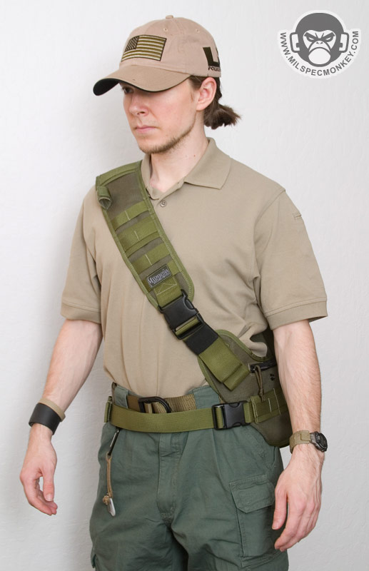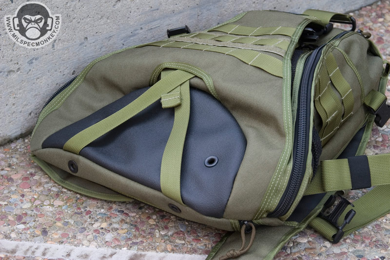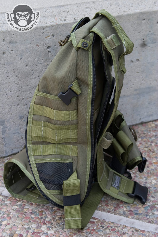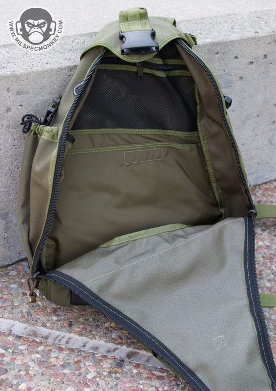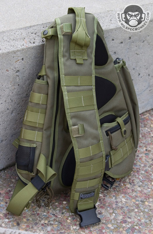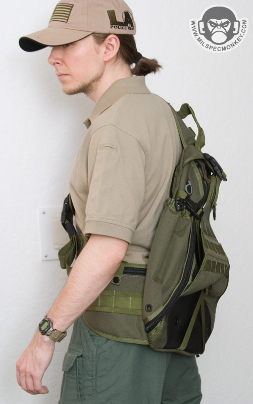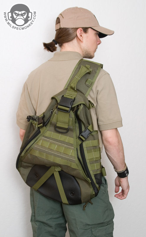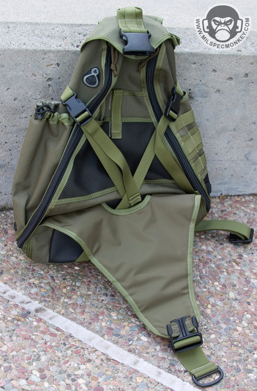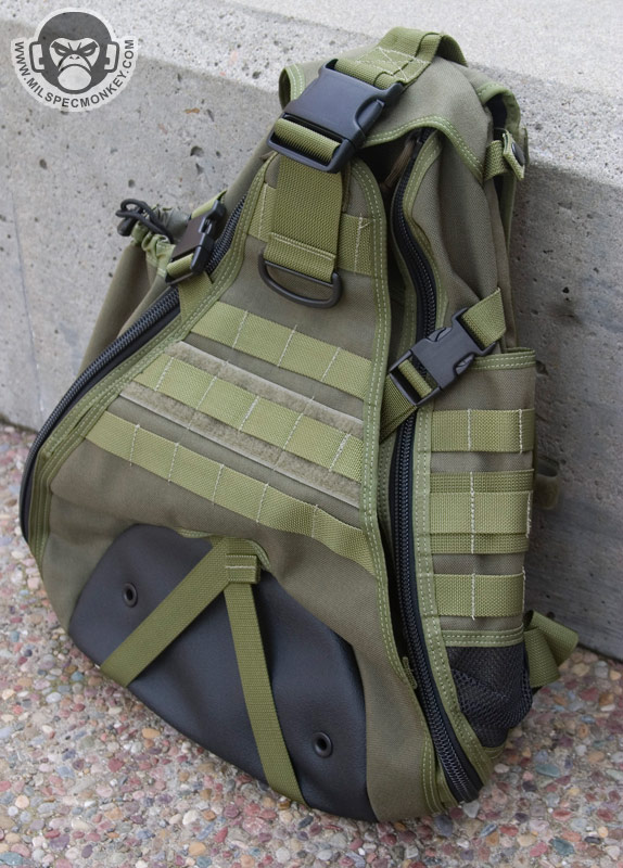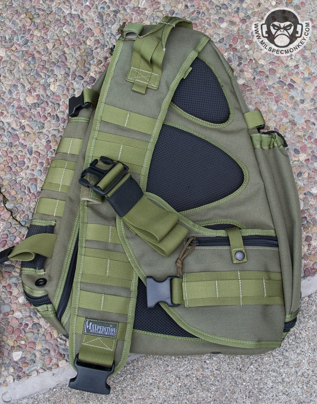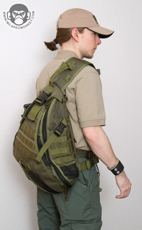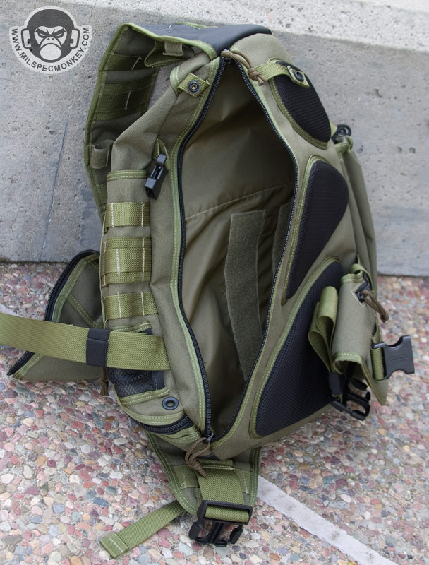 The Monsoon certainly is a unique design appealing more to the urban market, but certainly built tough enough for more demanding tasks. The teardrop shape is a little deceptive in which one can fit more than most think upon first impressions. As expected from the gearslinger name, this is a thick 1 strap shoulder bag design. The first outer flap is a little odd offhand, but allows for a platform to store bedrolls and similar items. The compression straps then can be under or ontop as desired. One side of the pack has PALS webbing and a small mesh sleeve while the other has a nice big Nalgene pouch. Next comes the double zipper main area which has extra sleeves and slim zipper compartments. Also inside is a side pouch for electronics like Ipods and nearby above is a cool rubber headphone porthole. In the far back is the hydration pocket area which has the usual loop velcro to allow for accessories. This pack is generally well padded, but I feel it is made for larger people. I am unable to tighten it to be snug and it rides a bit low. I will see if I can mod the main strap to be smaller soon for a better fit to my monkey size. The 2" velcro'd webbing on the front is for Maxpedition's sheath accessories. Currently available in Black, OD Green, Khaki, and ACU.