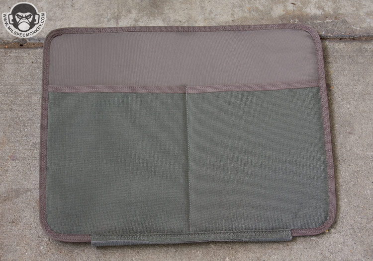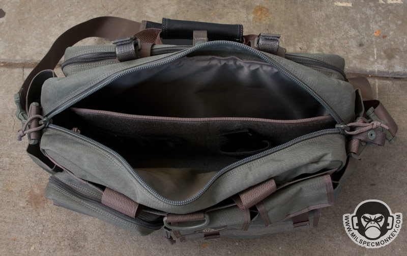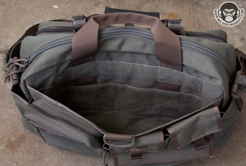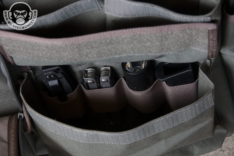The opposite side is one big double zippered area that unzips down most of the way, but not a full clamshell style. A snap loop is nearby to secure these zippers if desired. The flap itself is padded with a loop velcro area on the exterior and the interior back is an organizational sleeve fiesta. This area is great for holding paperwork and writing utensils, but hell if you wanted to you can fit a smaller laptop in here. Above this large pocket are some velcro loops that I guess are used to hold beatsticks and large flashlights. Since I use neither they kinda get in the way of the zippers by getting in the way of the handle so I plan to cut them off. The ends of the Aggressor have large tube pockets, one optimized to hold a water bottle and the other for large radios. One can mix and match as they wish, but the hydration side appropriately has a grommet for drainage and a thicker bungee flap. While down there it can be noted the bottom of the core bag has non-slip material for grip and enhanced water protection.