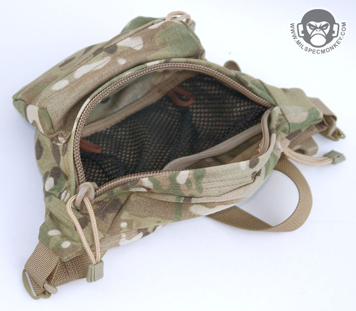 The main pocket is spacious with a bonus mesh area for oranization. Further smaller goodies can go in the front pocket and your flatter important business goes great in the back area. The straps are ingeniously designed to allow for many attachment possibilities starting with of course the usual waist strap which is included. This however, can be taken off thanks to the metal tri-glides, and one can use Gimlocks, Removeable SRBs, Alice clips, Silk clips, and more to attatch to gear with PALS or just webbing in general. PALS on the back of the bag also allow one to direct mount it to PALS webbing equipped gear. Overall awesome, but I'd like to see the main pocket have a double zipper setup. Comes with 3 small Malice Clips. *More pics and info to come as I get to test it out.
