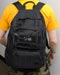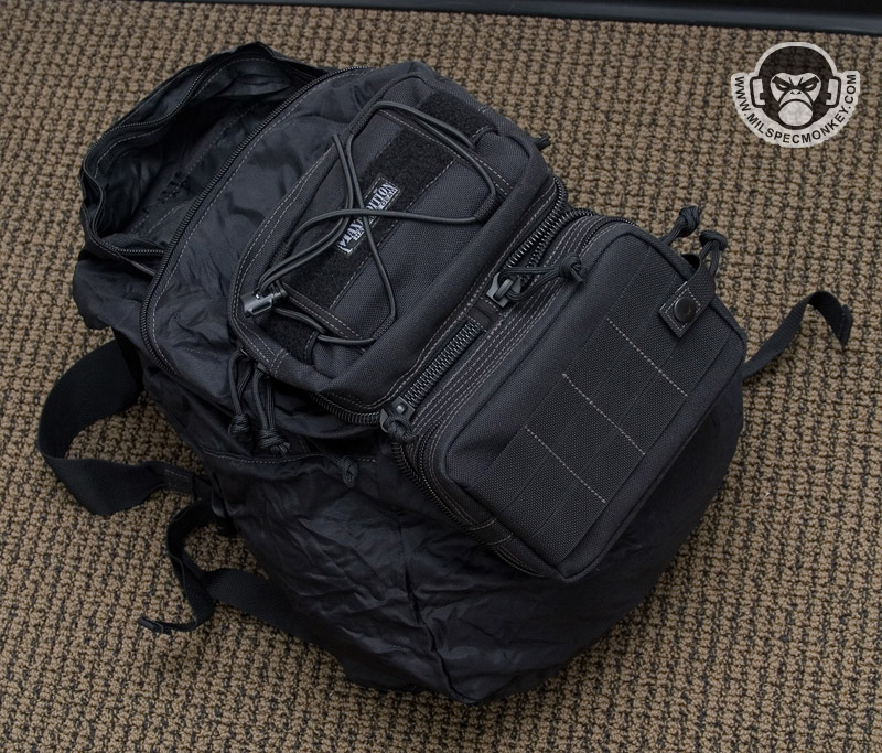 When all packed up the "front" has loop velcro for ID patches, a shockcord rig, and a sleeve loop for belt mounting. Double zippers open up a pouch with elastic loops inside. Moving to the opposite side is a similar sized pouch, but with PALS compatible webbing for using malice clips. Dual zippers open up clamshell style and the inside has interesting divider panel that makes the pouch separated for left and right access. The snap can be used as zipper divider for this setup or a zipper lock. Once the middle is expanded, both of the end pouches are easily accessible on the outside of the backpack. Athough the exterior is made of 1000d ballistic nylon, the backpack material is 420d so it can be packed up. The backpack has an extra hydration pocket with velcro opening and D-ring which can hold up to a 100oz bladder. Currently available in Black, Green, Khaki, and ACU.