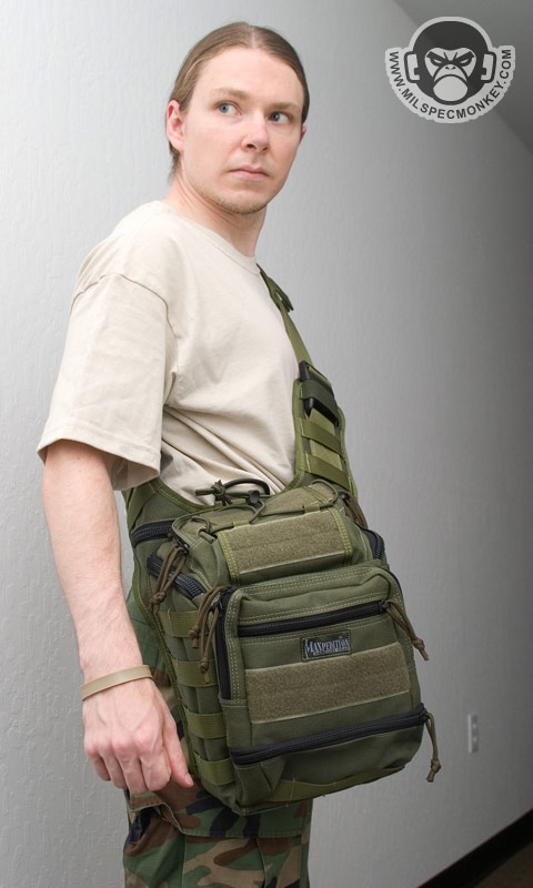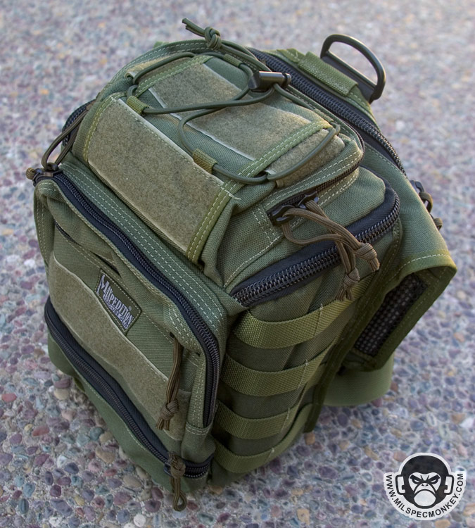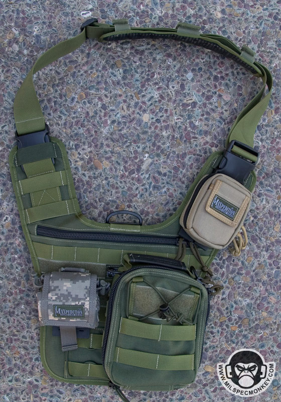 While the Colossus went in the size increase direction for the Versipack line, the Manta went the opposite way. The Manta on its own is not much more than beefy shoulder strapped CCW pocket, but has huge customization possibilities when other pouches are added. Due to all the PALS webbing on the front of the Manta, this makes a great platform to form the Versipack you always wanted or just need on specific day. One simply attaches other PALS compatible pouches as desired. The upper area is 3 Rows x 6 Channels (not counting 2 extra loops up top) and the lower area is 2 Rows x 4 Channels. The upper area has loop velcro between the PALS rows for ID patches. I'm not a fan of the Maxpedition logo being in the middle of the upper velcro strip, but one can destich it off without too much hassle. The lower area comes with a shock cord and cord lock rig and is ontop of a sleeve which is good for flashlight like items. I personally would have gone with 2 Rows x 6 Channels for the lower area. The sleeve area would be lost or harder to use, but this would allow a lot more mounting options. When creating loadouts for the Manta I find myself adding pouches where I want to, but they are less secure since the PALS webbing I spoke of is not there.
