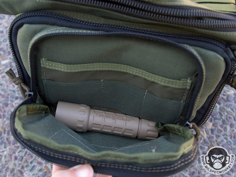 Moving a little further down is what I call the mid pocket. This area is a good square size and has 2 sleeves in the back each with elastic velcro flaps. Behind these is another divider sleeve. At the bottom is a velcro seal to allow one to close off or create access to the lower pocket. On the exterior of the mid pocket is a loop velcro panel and a slim single zipper pocket. Maxpedition has been listening to my suggestions and put the logo out of the loop so the pride can still be there, but not at the cost of your velcro space. Blending in at the bottom is the lower pocket which has a single zipper opening and can fit a beefy, but not super long flashlight.