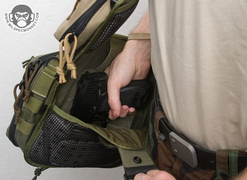 The back area is for the most part totally new. For cooling standoff, foam with rubberized nylon grid is used which looks like it will be much more durable than the air-mesh on the Jumbo. A good dose of this is on the back and the shoulder strap connection areas. Up on the strap areas are sleeves which work well for holding folding knives. I show these sleeves can fit multitools in my pictures, but they are not the most comfortable things to carry there. In the middle is another CCW pocket which is closed with a hypalon flap. The closure is velcro with a metal snap in the middle and a D-ring is up top for an easy grab to get to the pocket. The velcro belt loop connection is also on the hypalon area which can fit up to 2.5" belts. For those who don't know what hypalon is yet; it is really heavy duty rubber-ish material with little give and non-slip qualities. Inside this back area is another 7" x 8" loop field for another place to put modular velcro attachments. Although I do not have one to try, this pocket is also made to fit a 50oz. or smaller hydration reservoir and has a webbing loop for a hanging point. Despite being easier to open up, I don't like this area as much for CCW. The pistol handle can be fairly visible when viewing the side of the pouch and you can't use the belt strap since it interferes with pulling the pocket open. A pistol is easier to get a hold of without the modular holster, but then it is less secure and could flop out while running. Even though I don't sound so jazzed about this back pocket, it is nice to have it there rather than nothing and likely others will find great uses for it.