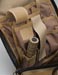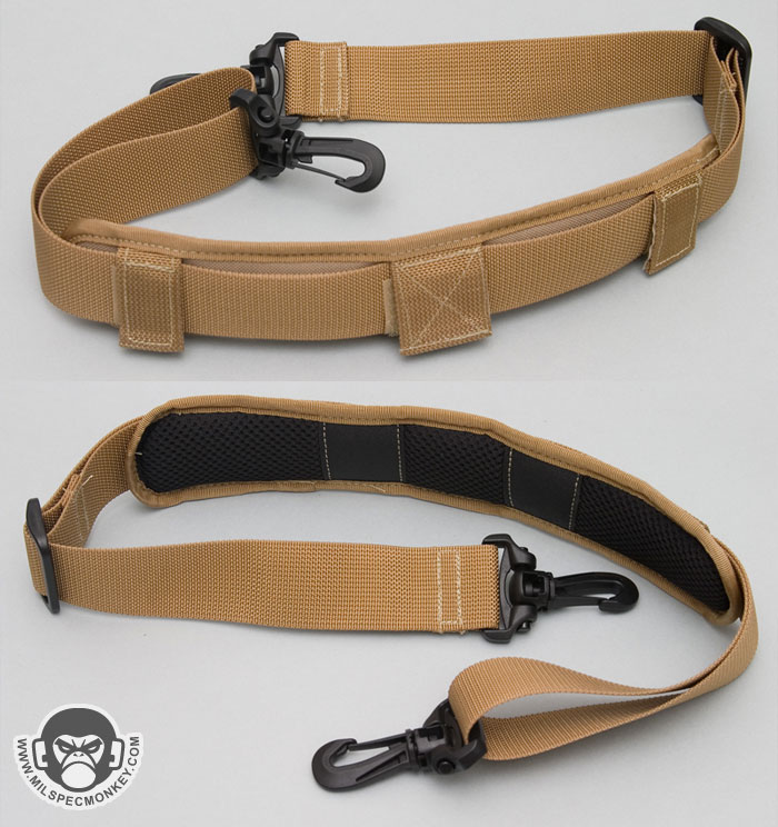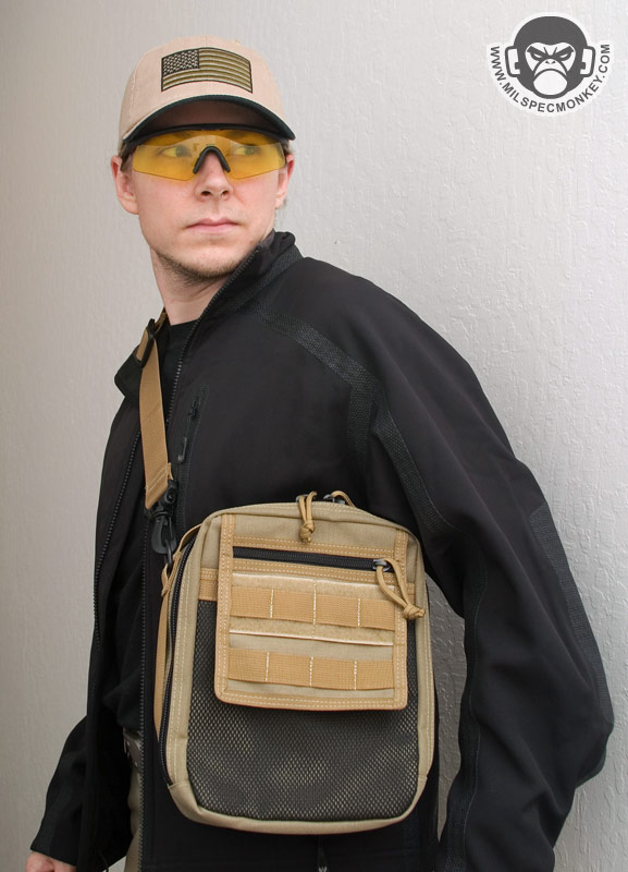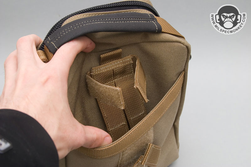Core features on the exterior include a non-slip covered handle on top and long webbing strips on the side which can also be used as side carry handles. The frontal upper right has a snap to secure the pull ties of the zippers to the main pouch. D-rings on both upper sides are the main connection points for the shoulder strap, but can also be used as alternate connection points when mounting to other gear. The shoulder strap is done in the style common to versipack line that is 1.5", uses plastic snap hooks and includes an adjustable / removable shoulder pad. The back has a pretty fancy setup to connect to belts or PALS webbing. Integrated with a large sleeve pocket are 2 long vertical webbing strips and 2 horizontal strips all with velcro to create secure loops. The upper part of this area has a sewn small webbing loop to be another tie down point. The pictures likely describe this a lot better than my words.