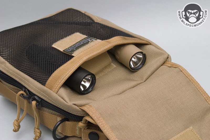 The end result? Well you can carry a crapload of flashlights / multitools / folding knives / and small papers. PDAs, MP3 players, and other small electronics will also fit in there well, but common tools like pliers and drivers are harder to put in unless accommodating pouches are added to the velcro panel. For the larger or odd-shaped items, the velcro panel can be taken out to allow full carrying potential in the middle inside of the Neatfreak. If you want a mean EDC gadgeteer pouch or a large organizer for your packpack, I suggest you check the Neatfreak out. For those with more tactical needs, the Neatfreak also makes for a pretty decent medic or E&E bag.